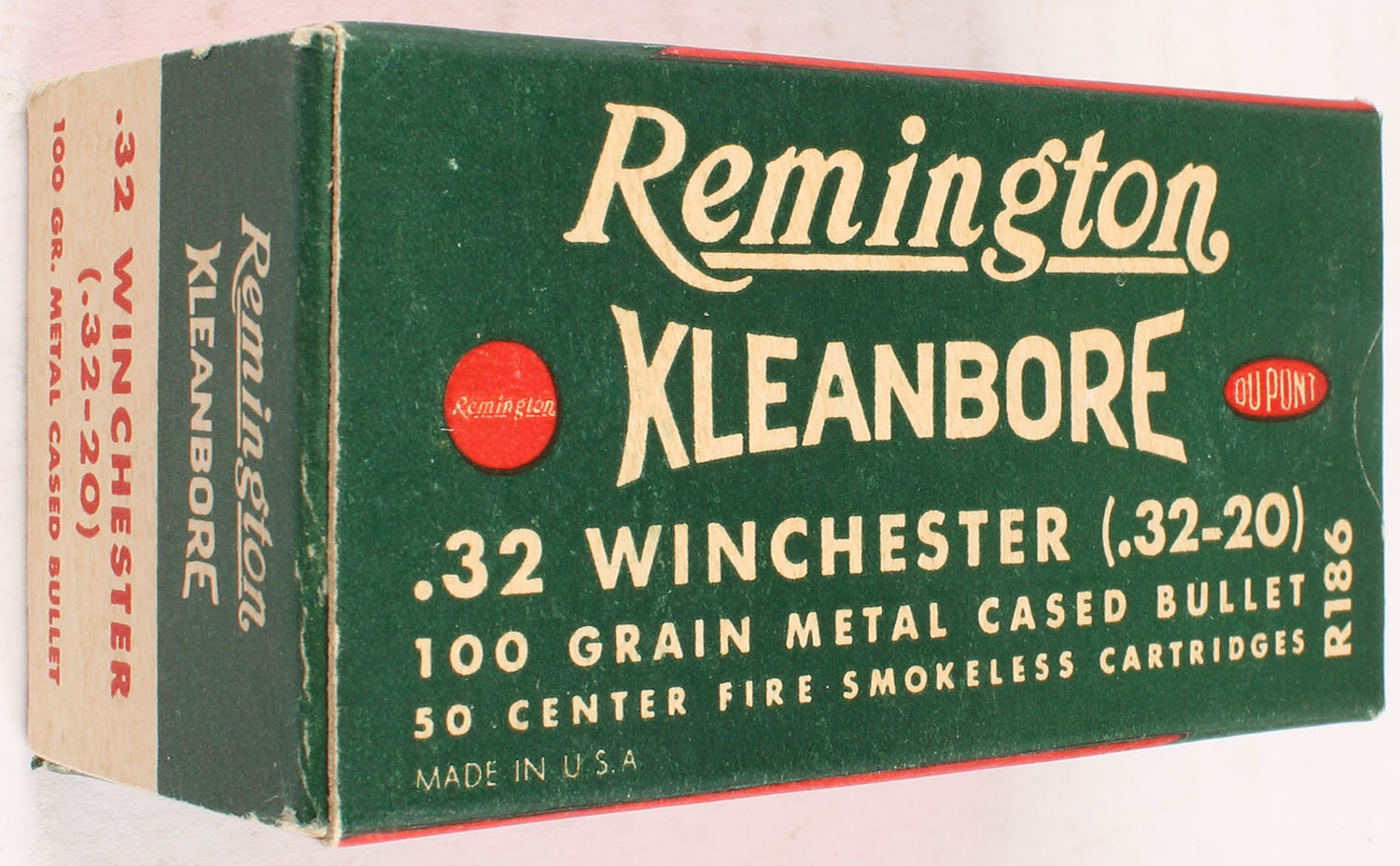 Remington, Kleanbore, .32 Winchester (.32-20), 100 Grain Metal Cased Bullet, Full, 1pc. Green red & white box, box is near mint with excellent to minty color, only very minor age soiling, corners are mostly sharp, edges are crisp, end flaps are solid, ammo is excellent. Grade: Excellent ++ - Value: 60 to 180