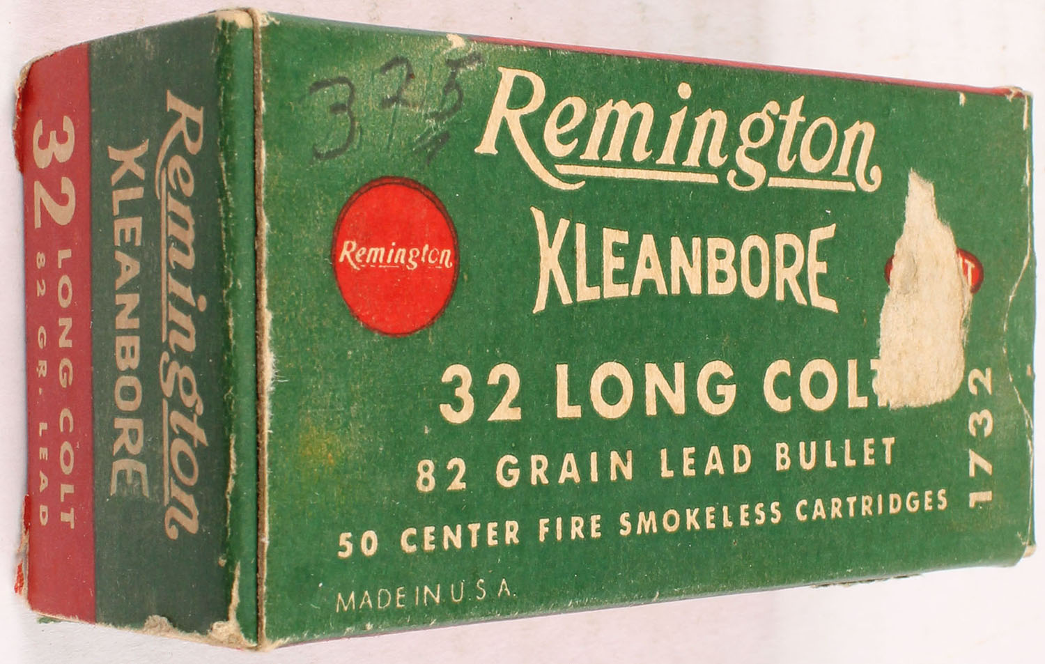 Remington, Kleanbore, .32 Long Colt, 82 Grain Lead Bullet, Full, 1pc. Green red & white box, box is solid with very good to excellent color, minor age soiling, scuffing, top has been written on, some corner wear, edges are mostly crisp, end flaps are solid, ammo is excellent. Grade: Very Good ++ - Value: 60 to 180