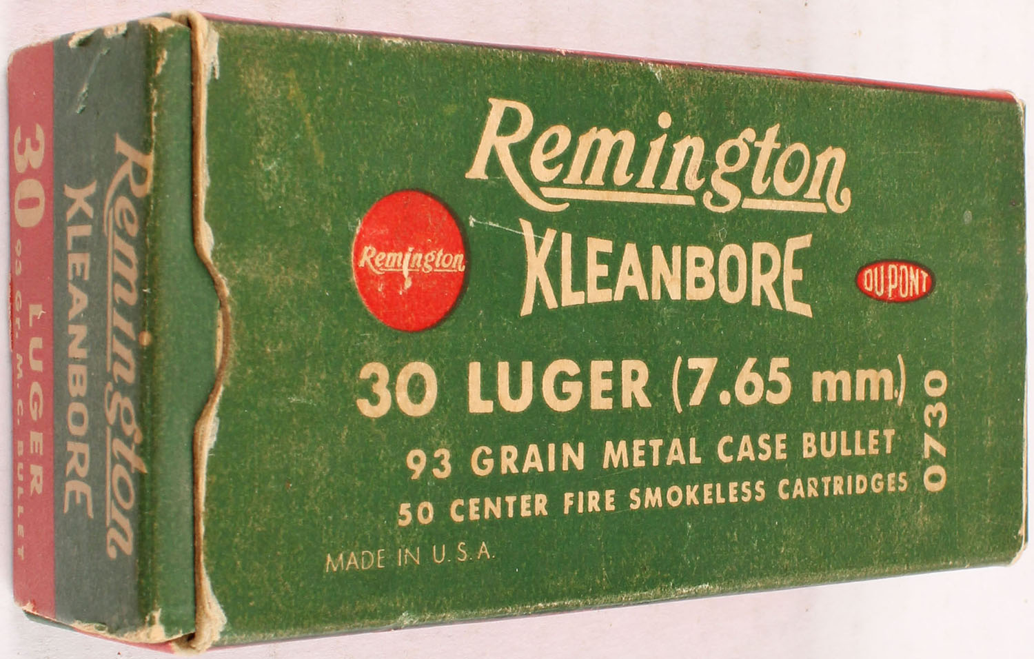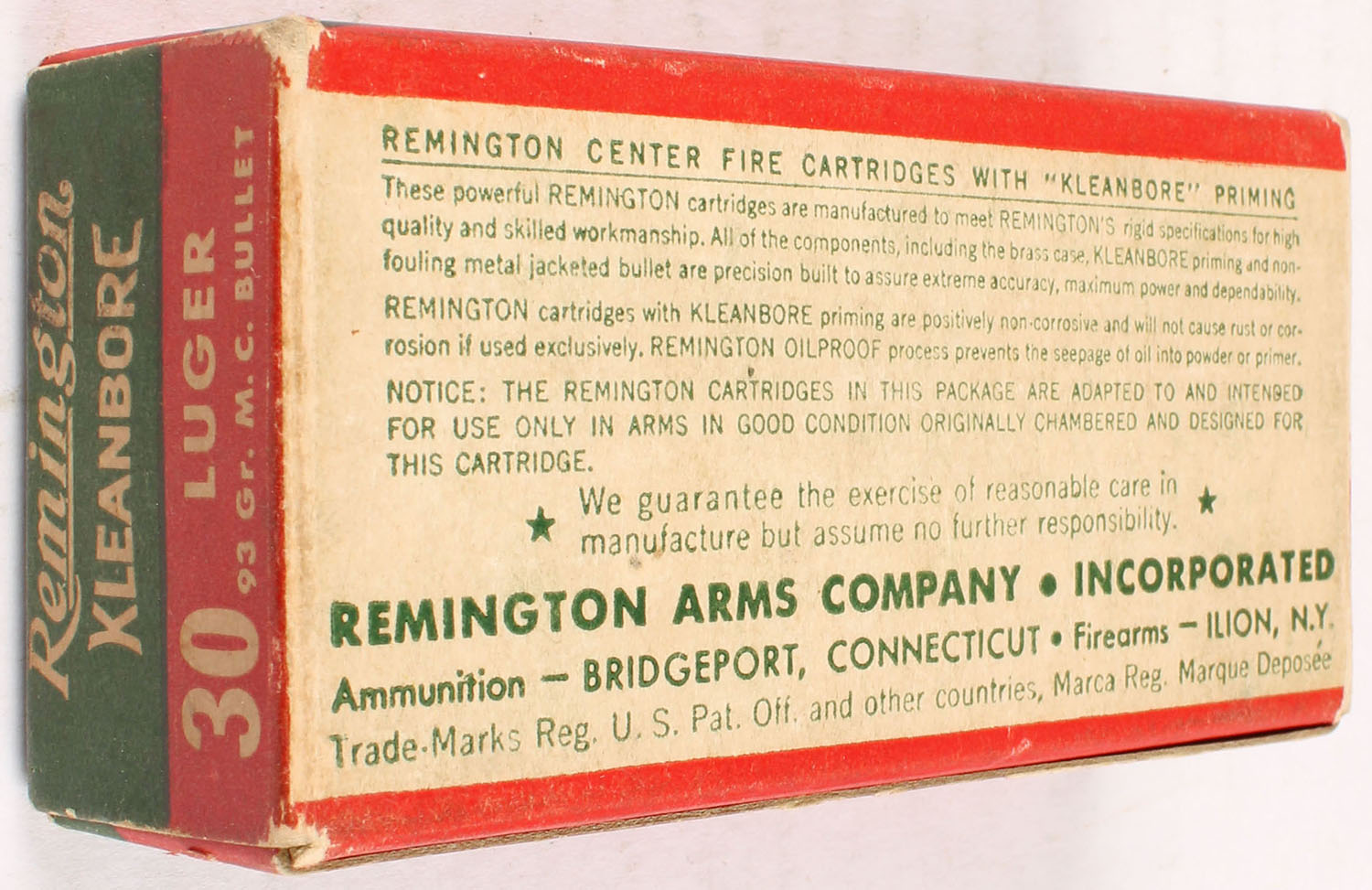 Remington, Kleanbore, .30 Luger, (7.65mm), 93 Grain Metal Case Bullet, Full, 1pc. Green red & white box, box is solid with very good to excellent color, minor age soiling & shelf wear, some corner wear, edges are crisp, end flaps are solid, ammo is excellent. Grade: Excellent - Value: 20 to 60