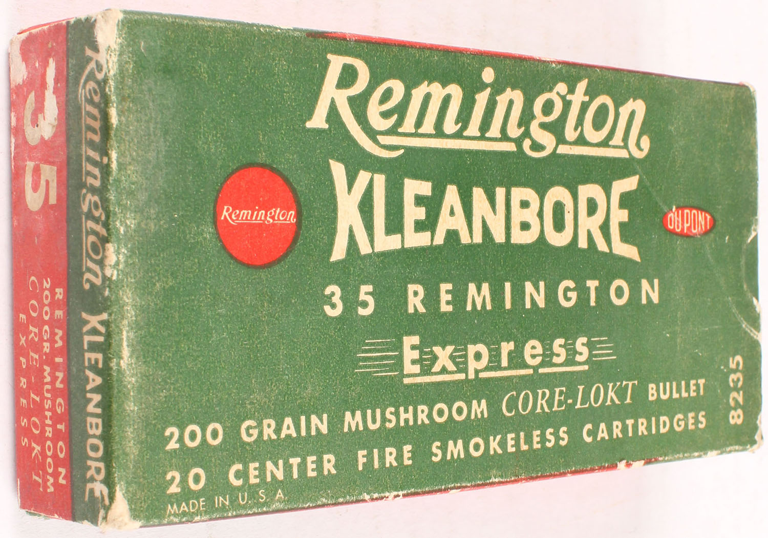 Remington, Kleanbore Express, .35 Remington, 200 Grain Mushroom Core-Lokt Bullet, Full, 1pc. Green white & red box, box is solid with very good to excellent color, minor age soiling, some shelf & corner wear, minor edge wear, end flaps are solid, ammo is excellent. Grade: Excellent - Value: 30 to 90