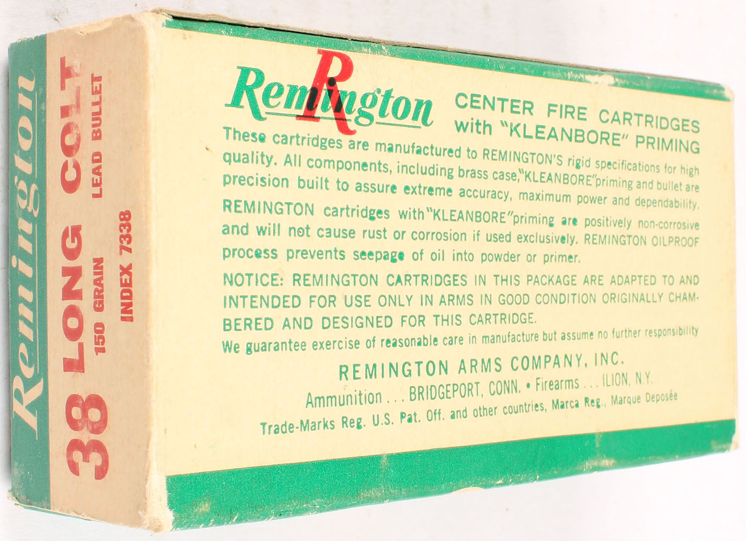 Remington, .38 Long Colt, 150 Grain Lead Bullet, Full, 1pc. Green white & red box, box is solid with very good to excellent color, minor age soiling, some shelf wear, minor edge & corner wear, end flaps are solid, ammo is excellent. Grade: Very Good ++ - Value: 30 to 90