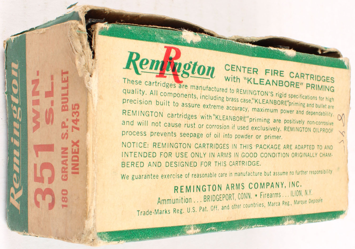 Remington, .351 Winchester Self Loading, 180 Grain Soft Point Bullet, Partial 49rds. (24rds. Correct), 1pc. Green white & red box, missing left end flap, seam split to bottom back edge, good color, age soiling, corner wear, some edge ear, right end flap is solid, ammo is excellent. Grade: Fair - Value: 20 to 100
