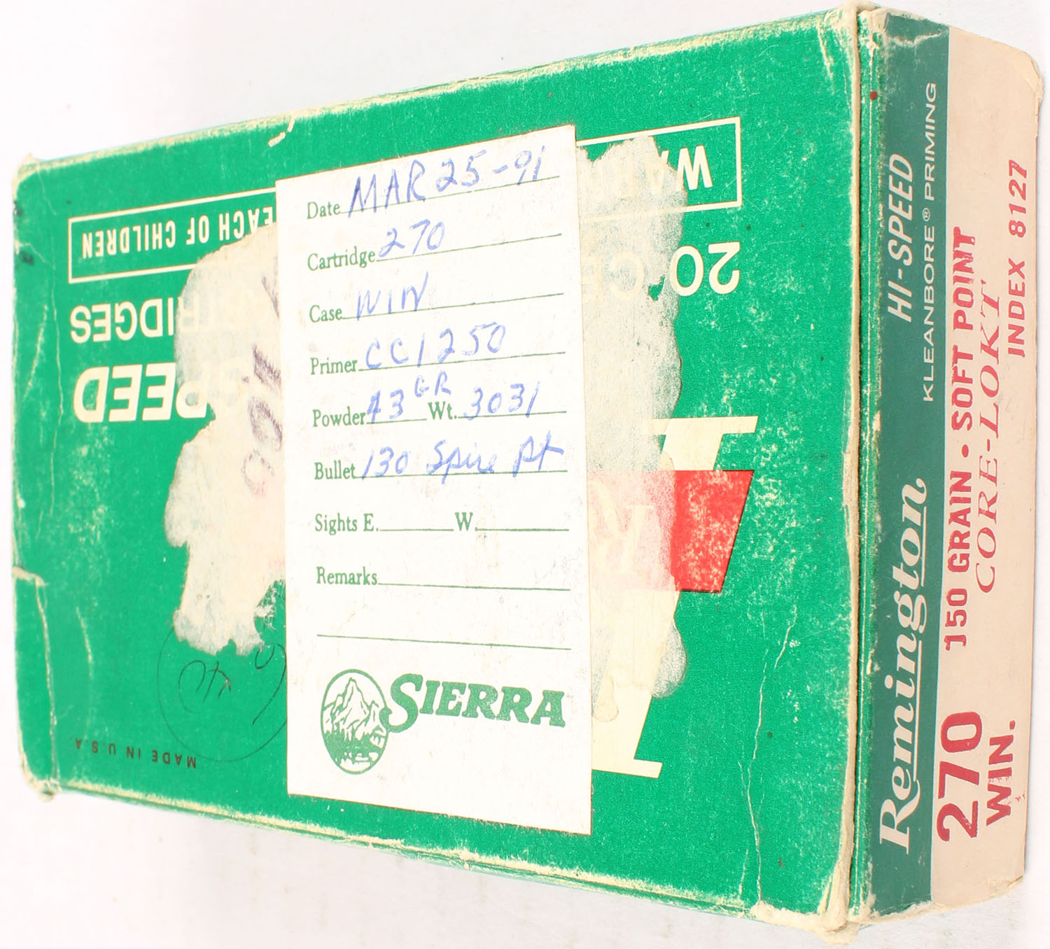 Remington, Hi-Speed, .270 Winchester, Full of incorrect ammo, 1pc. Green white & red box, box is solid with good color, some age soiling, shelf wear, some edge & corner wear, end flaps are solid, ammo is very good. Grade: good - Value: 2 to 20