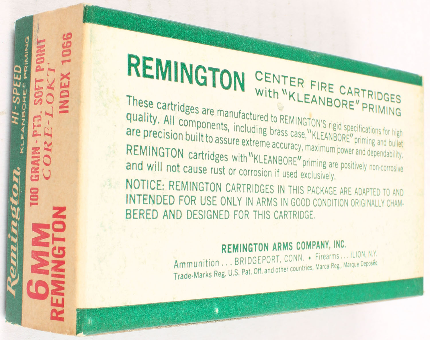 Remington, Hi-Speed, 6mm Remington, 100 Grain Pointed Soft Point Core-Lokt, Full, 1pc. Green white & red box, box is solid with excellent color, very minor age soiling, corners are mostly sharp, edges are crisp, end flaps are solid, ammo is excellent. Grade: Excellent + - Value: 20 to 60