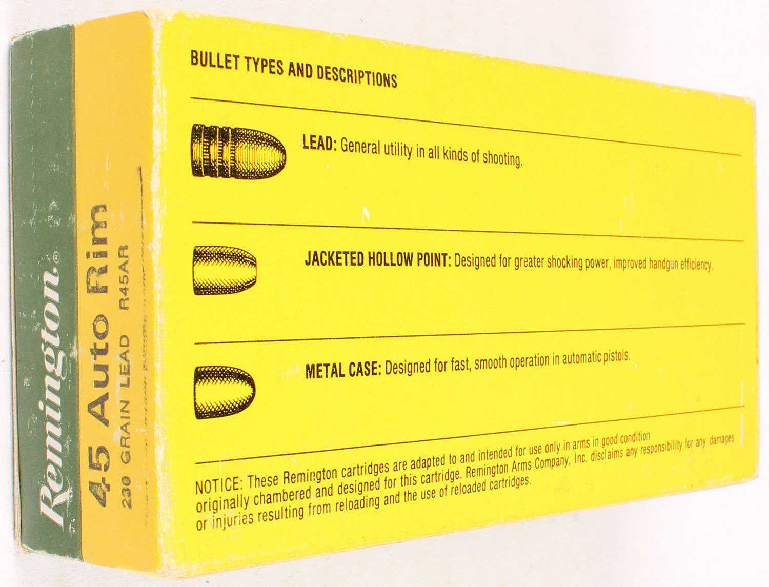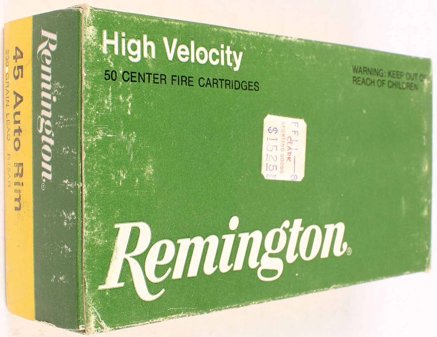 Remington, High Velocity, .45 Auto. Rim, 230 Grain Lead, Full, 1pc. Green yellow & white box, box is solid with excellent color, minor shelf wear, very minor edge & corner wear, end flaps are solid, ammo is very good. Grade: Excellent - Value: 10 to 40