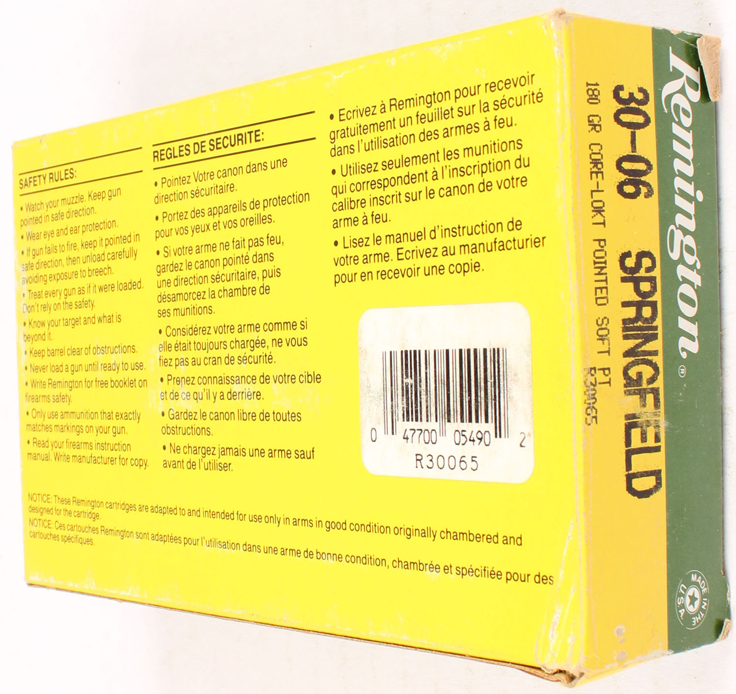 Remington, High Velocity, .30-06 Springfield, 180 Grain Core-Lokt Pointed Soft Point, Partial 18rds. correct, 1pc. Green yellow & white box, box is solid with excellent color, some shelf wear, very minor edge & corner wear, end flaps are solid, ammo is excellent. Grade: Excellent - Value: 10 to 40