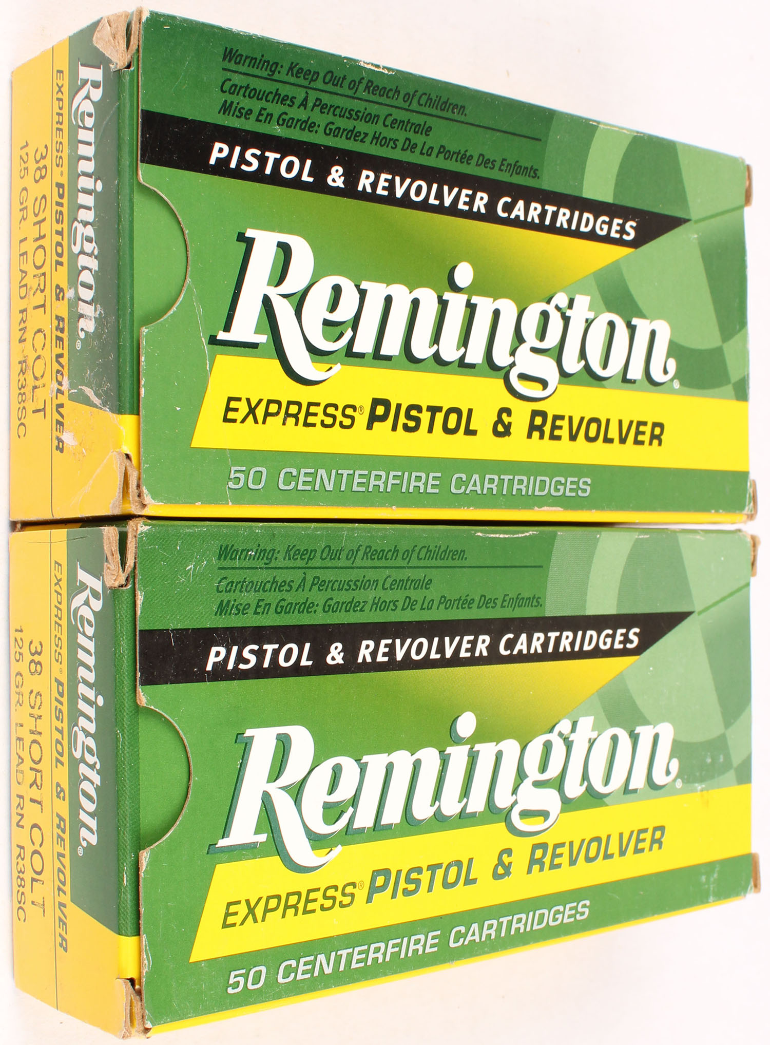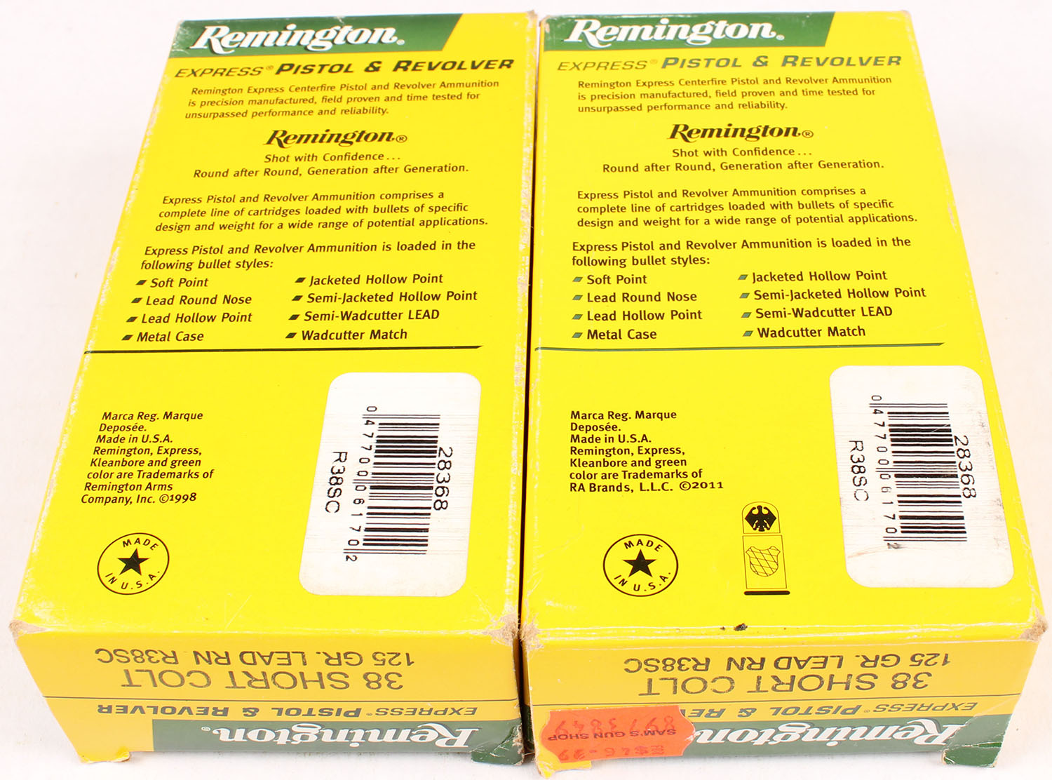 Lot of 2 Remington, Express, 38 Short Colt, 125 Grain Lead Round Nose, Full, 1pc. Yellow, green, white & black box, box is solid with very good color, end flaps are solid, ammo is excellent. Grade: Excellent - Value: 10 to 50