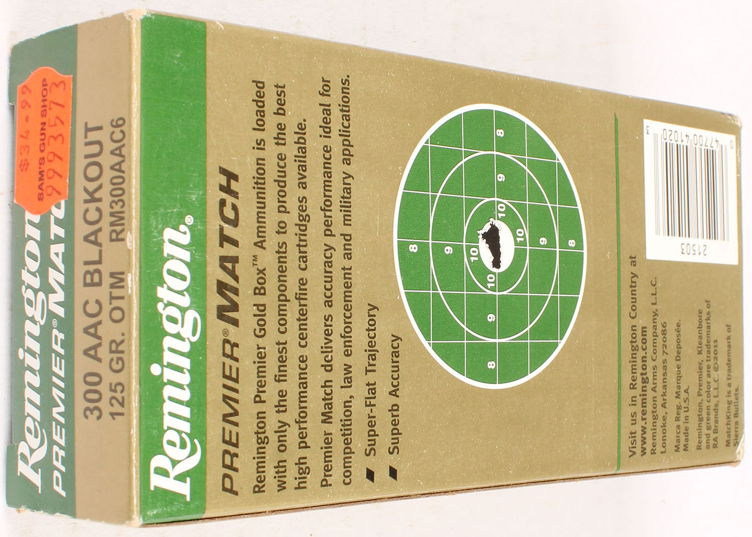 Remington, Premier Match, 300 AAC Blackout, 125 Grain OTM, Full, 1pc. Gold, green, white & black box, box is solid with great color, end flaps are solid, ammo is excellent. Grade: Excellent - Value: 20 to 80