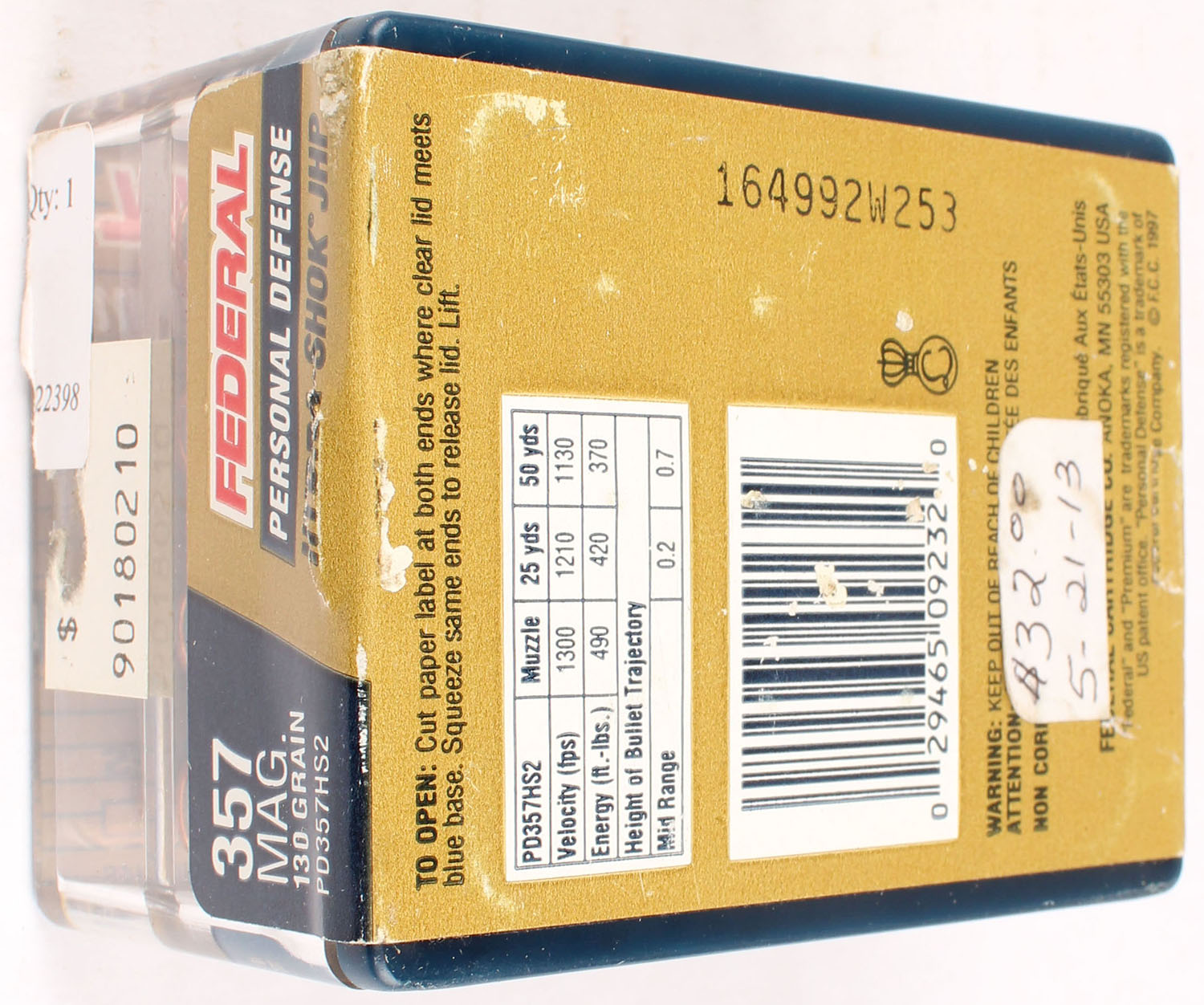 Federal, Personal Defense, 357 Mag, 130 Grain Hydra Shok JHP, FULL & SEALED, 1pc., multi-colored box, box is solid, light shelf wear & very good color, ammo is excellent. Grade: Very Good ++ - Value: 10 to 40