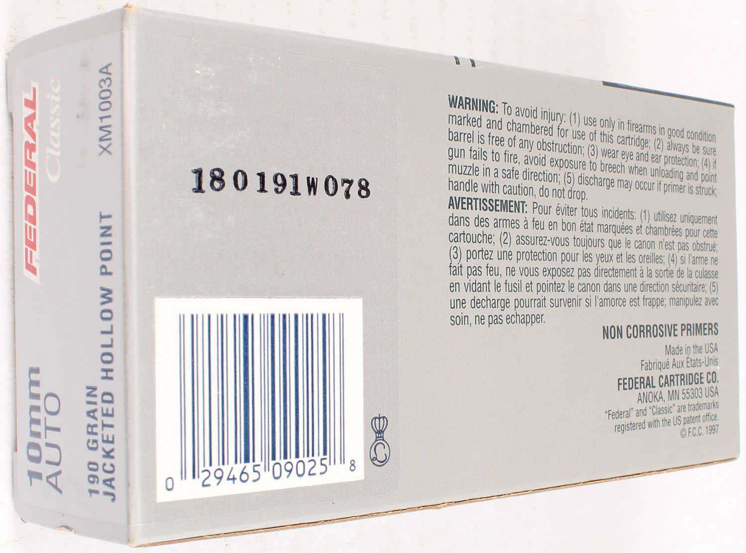 Federal, Classic, 10mm Auto, 190 Grain Jacketed Hollow Point, Full, 1pc., multi-colored box, box is solid with great color, end flaps are solid, ammo is excellent. Grade: Excellent + - Value: 20 to 80