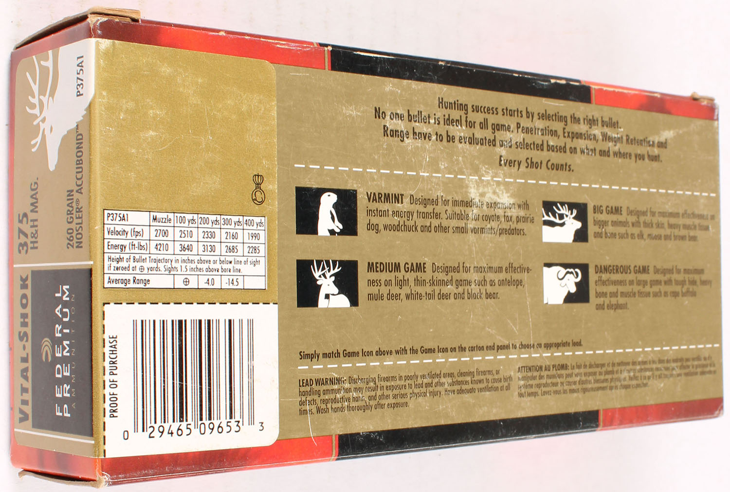 Federal, Vital-Shok, 375 H&H, 260 Grain Nosler Accubond, Full, 1pc., multi-colored box, box is solid with very good color, shelf wear, light edge & corner wear, end flaps are solid, ammo is excellent. Grade: Very Good ++ - Value: 20 to 80