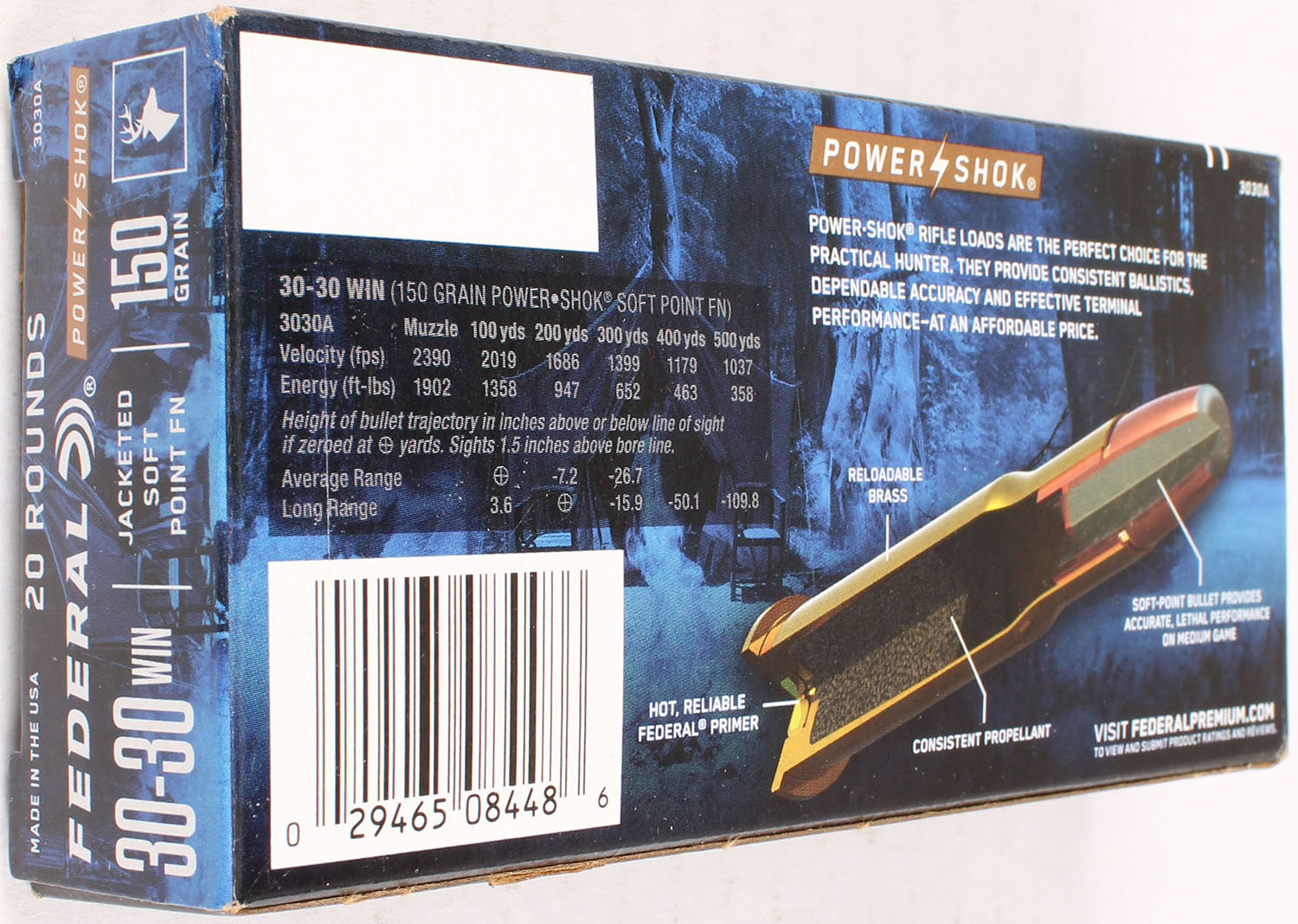 Federal, Power-Shok, 30-30 Win, 150 Grain Jacketed Soft Point FN, Full, 1pc., multi-colored box, box is solid with great color, end flaps are solid, ammo is excellent. Grade: Excellent + - Value: 10 to 50