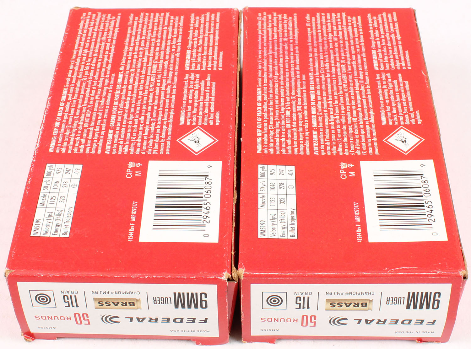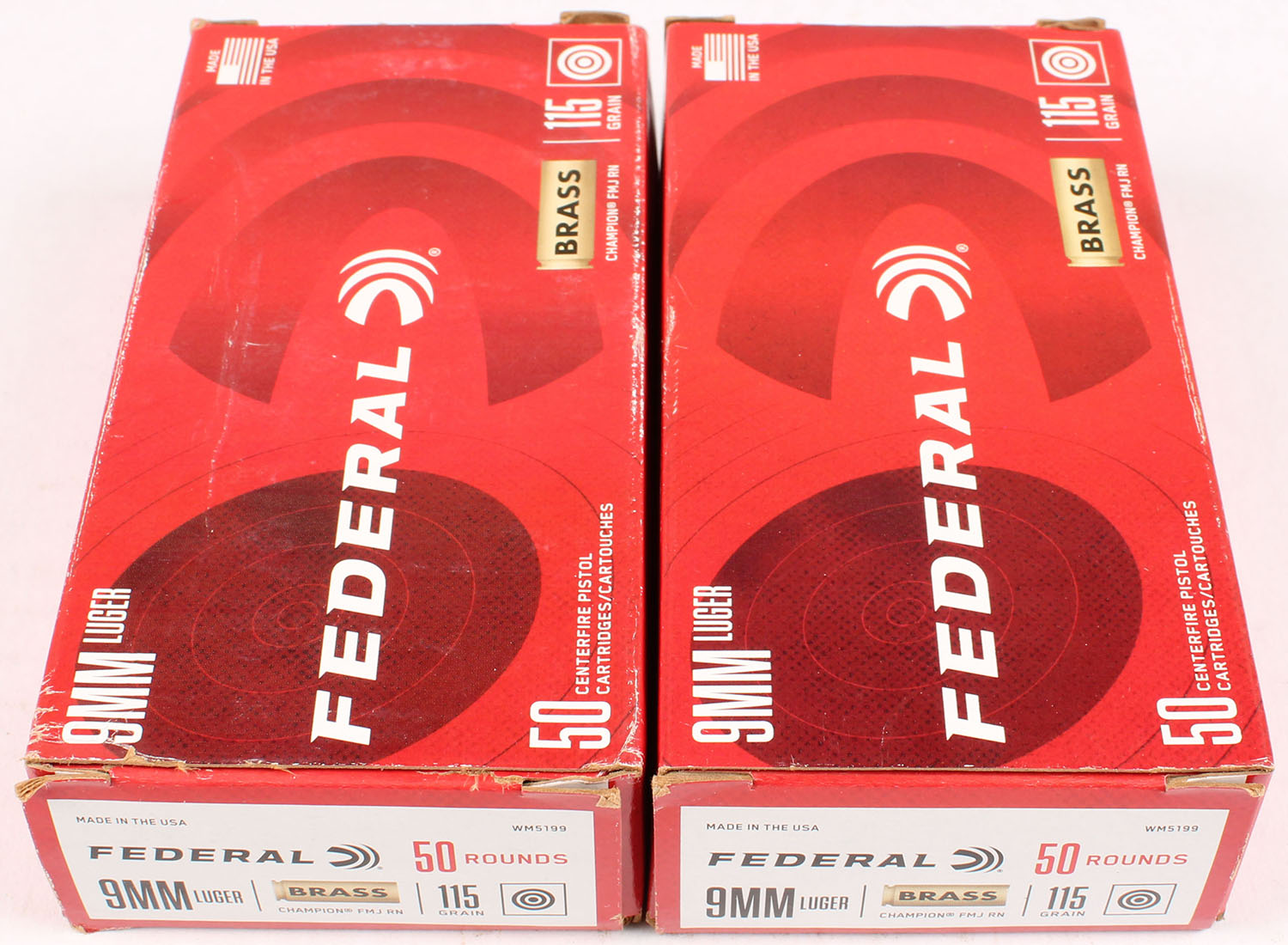 Lot of 2 Federal, 9mm Luger, 115 Grain Champion FMJ RN, Full, 1pc., multi-colored box, box is solid with very good color, light edge & corner wear, end flaps are solid, ammo is excellent. Grade: Excellent - Value: 10 to 60