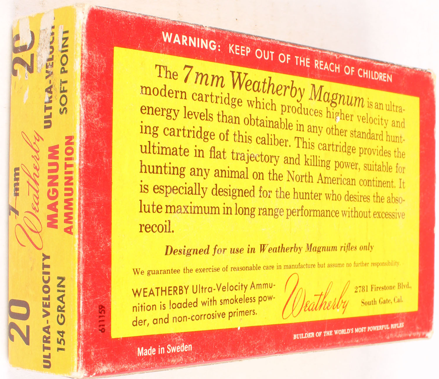 Weatherby, 7mm W.M., 154 Grain Ultra Velocity Soft Point, Full, 1pc., multi-colored box, box is solid with very good color, light corner & edge wear, light shelf wear, end flaps are solid, ammo is excellent. Grade: Excellent - Value: 20 to 80