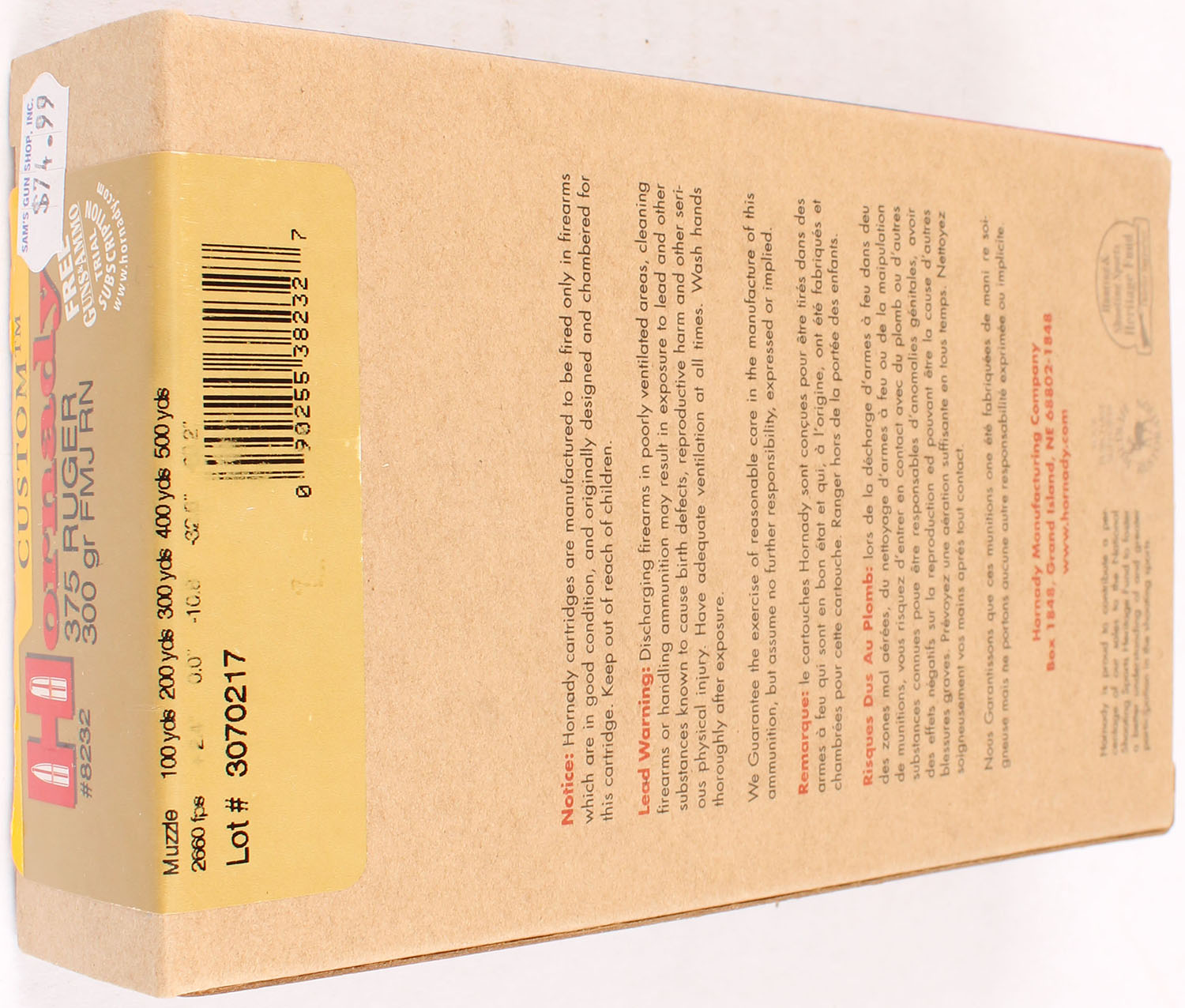 Hornady, Custom, 375 Ruger, 300 Grain FMJ RN, Full, 1pc. multi-colored box, box is solid with excellent color, Ammo is excellent. Grade: Excellent + - Value: 20 to 60