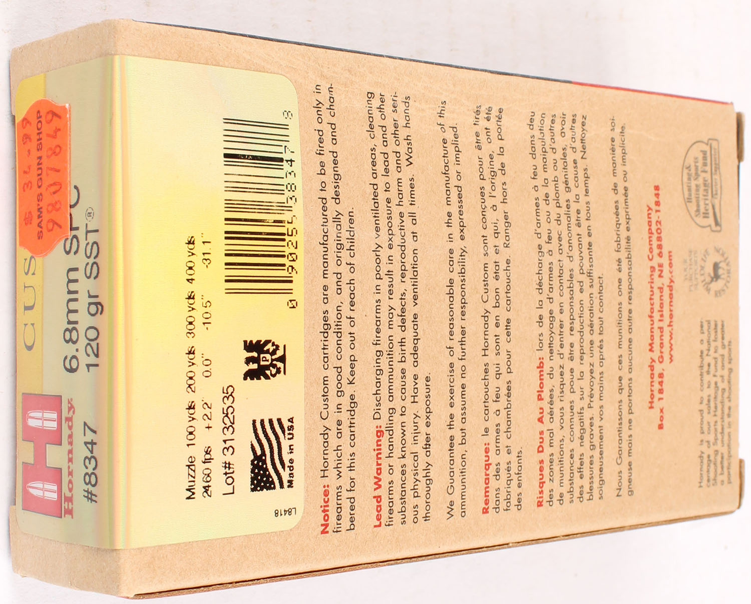 Hornady, Custom, 6.8mm SPC, 120 Grain SST, Full, 1pc. multi-colored box, box is solid with excellent color, Ammo is excellent. Grade: Excellent ++ - Value: 16 to 40