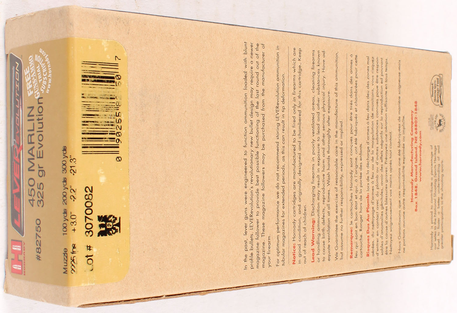 Hornady, LeverEvolution, 450 Marlin, 325 Grain Evolution, Full, 1pc. multi-colored box, box is solid with excellent color, Ammo is excellent. Grade: Excellent ++ - Value: 50 to 150
