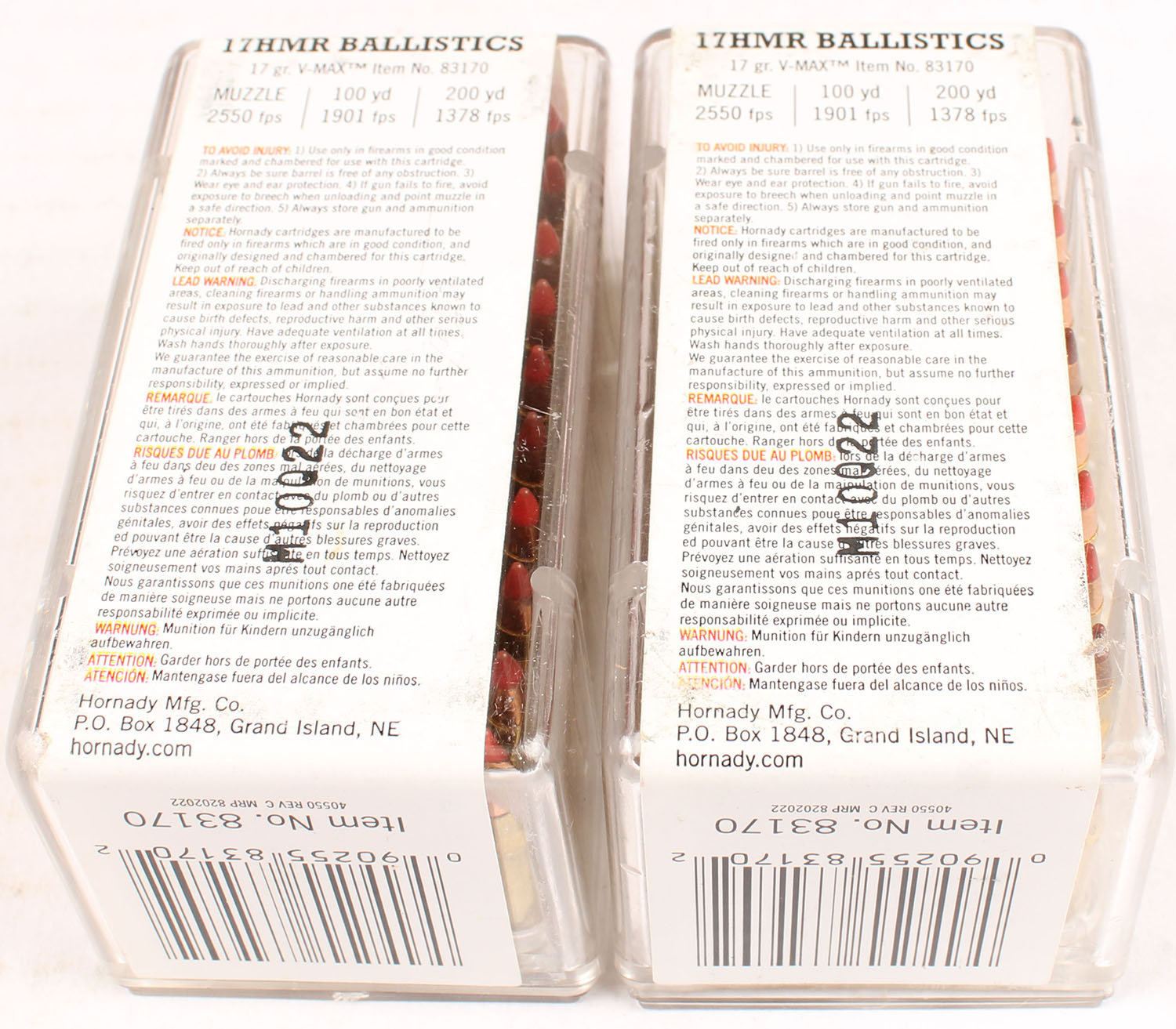 Lot of 2 Hornady, 17 HMR, 17 Grain V-Max, FULL & SEALED, 50 rds each or 100 total rounds. 1pc. Multi-colored boxes, boxes are solid with excellent color, Ammo is excellent. Grade: Excellent - Value: 10 to 40