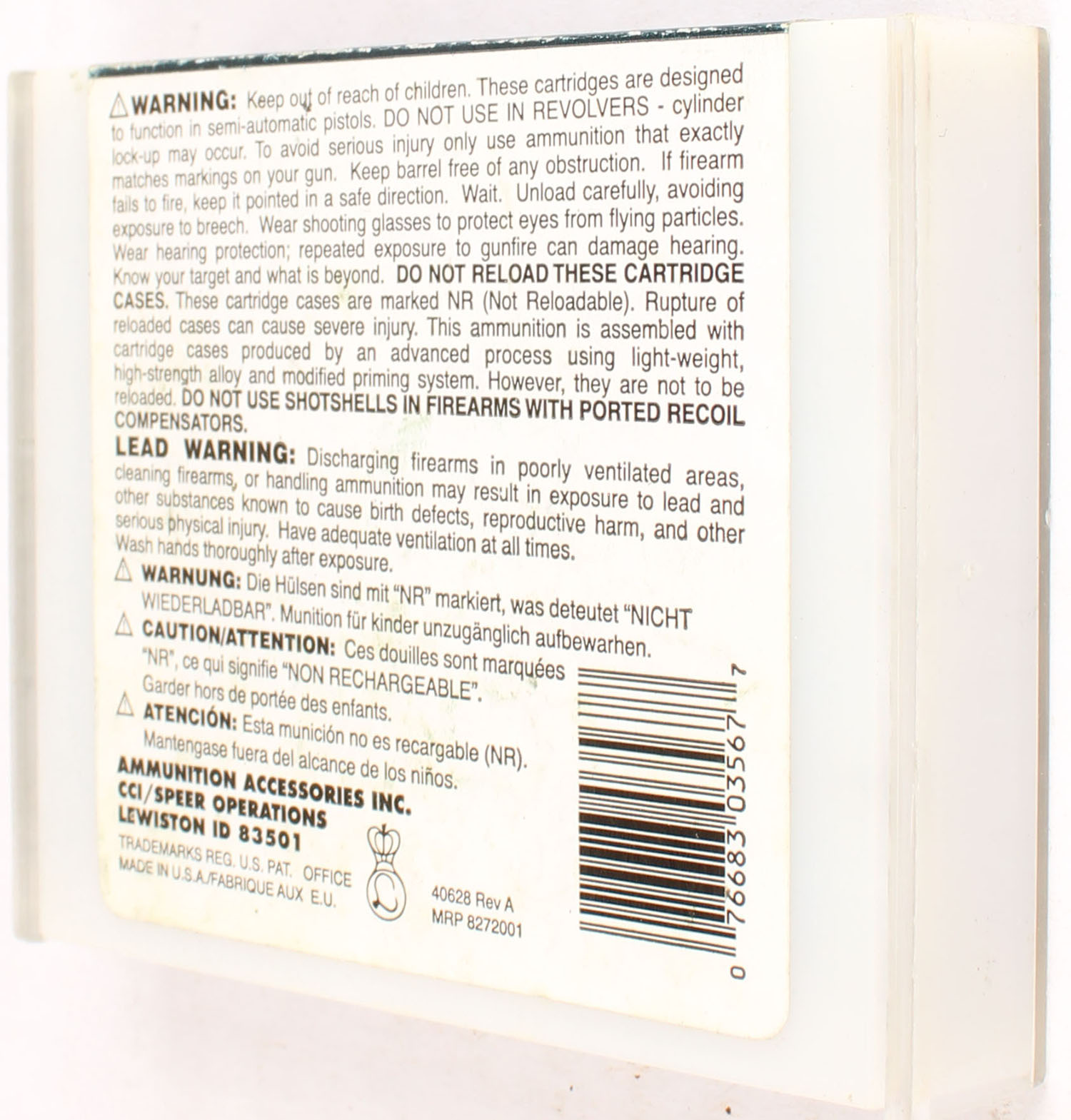 CCI, .45 auto Shotshells, 210 pellets, Full, 1pc. multi-colored box, box is solid with excellent color, Ammo is excellent. Grade: Excellent ++ - Value: 16 to 50