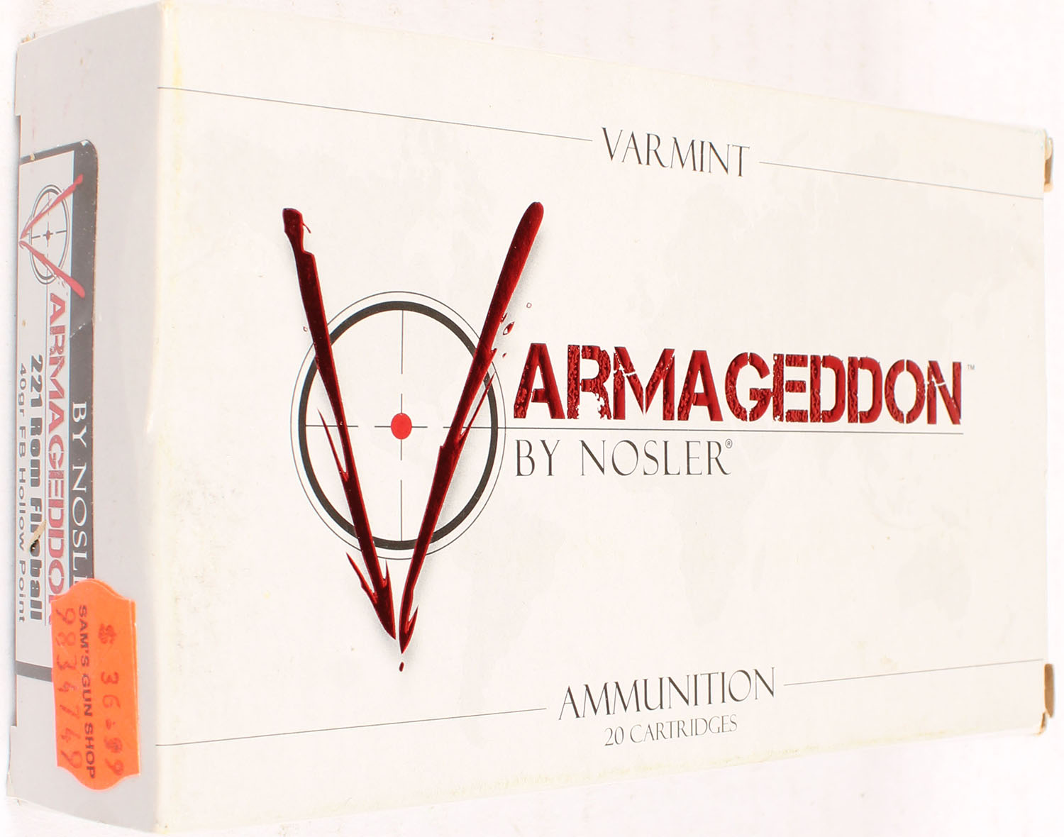Nosler Armageddon, .221 Rem Fireball, 40 Grain FB HP, Full, 1pc. multi-colored box, box is solid, Ammo is excellent. Grade: Excellent ++ - Value: 16 to 50