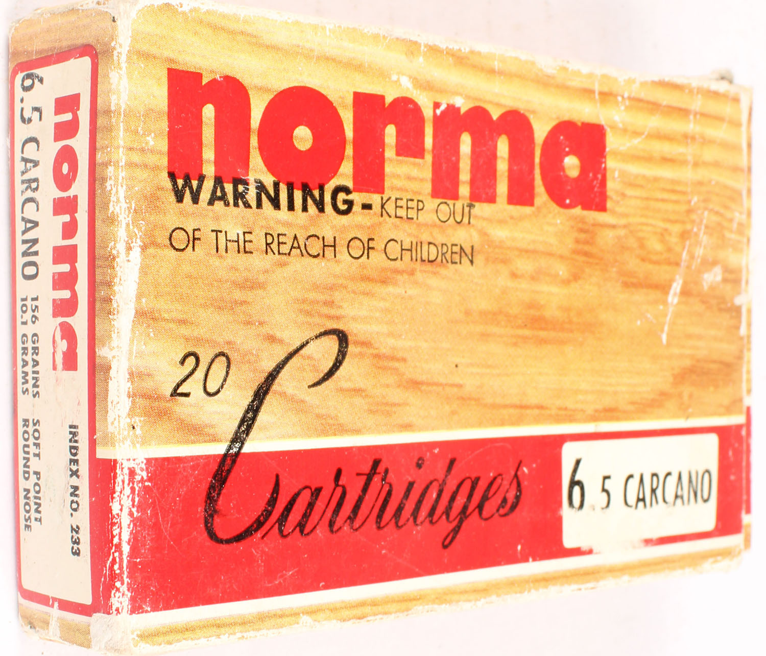 Norma, 6.5 Carcano, 156 Grains Soft Point, Full, 1pc. multi-colored box, box has scuffing, Ammo is excellent. Grade: Very Good ++ - Value: 20 to 60