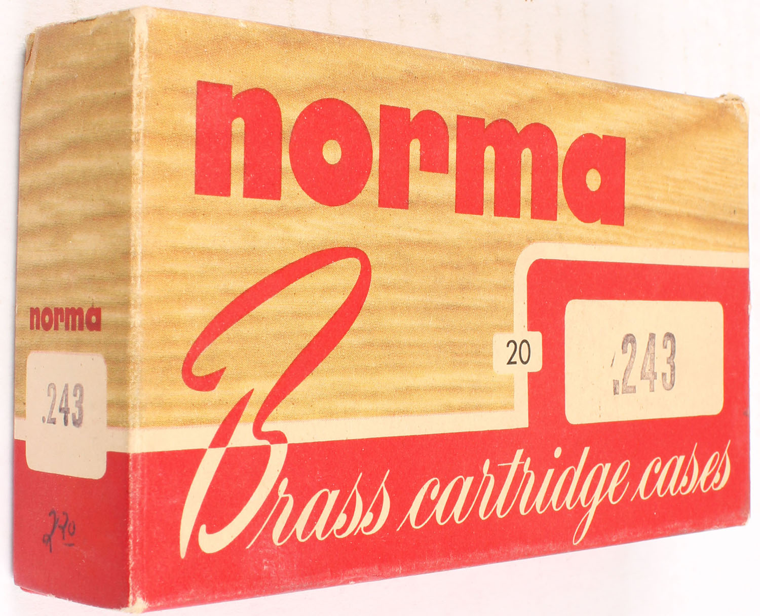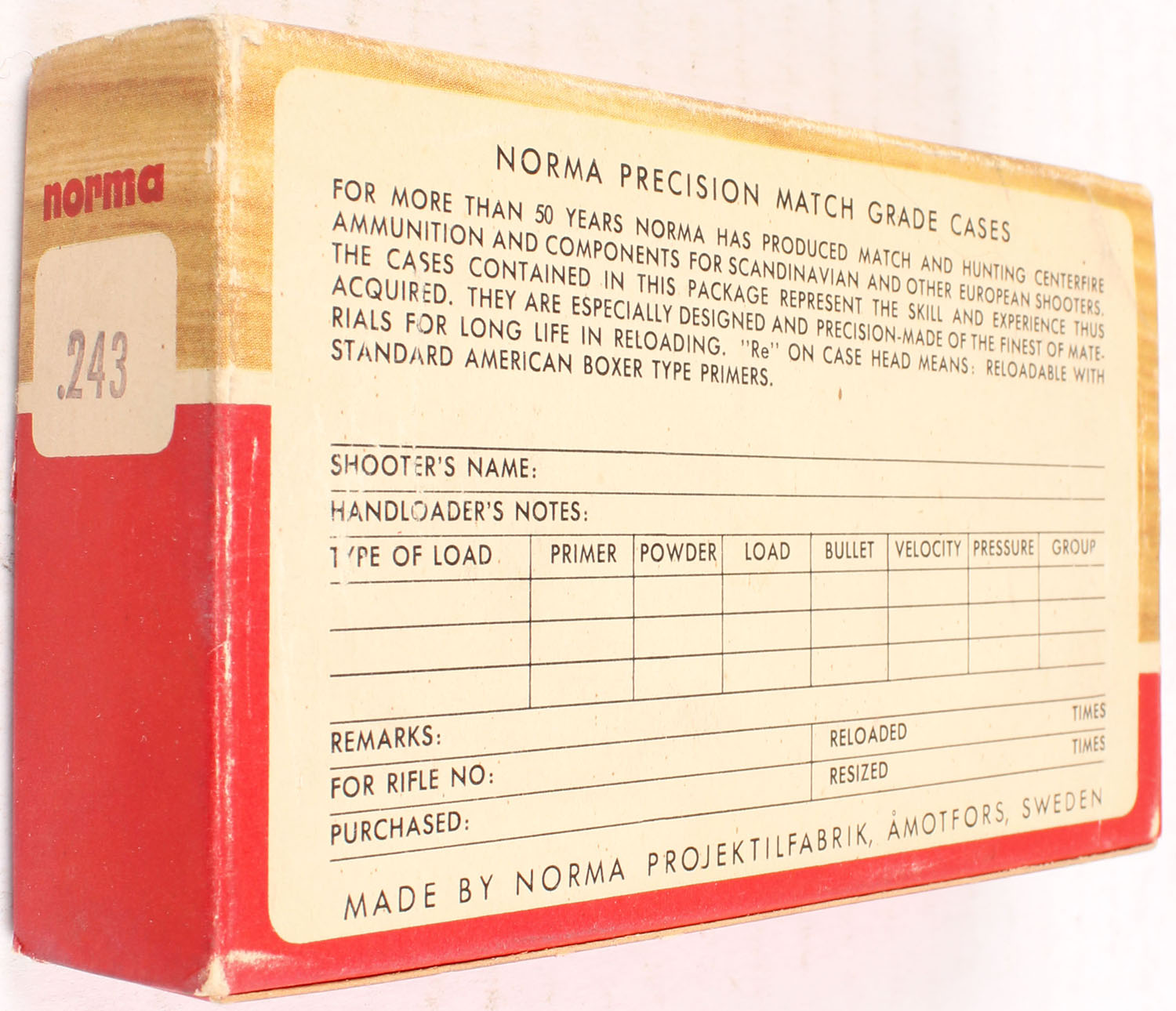 Norma, .243 unprimed cases, FULL. 1pc. multi-colored box, box is solid, Ammo is excellent. Grade: Excellent - Value: 4 to 40