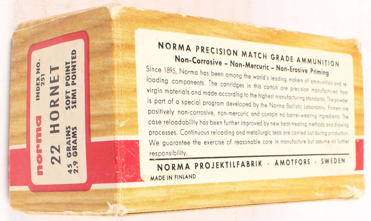 Norma, .22 HORNET, 45 Grains Soft Point, Full, 1pc. multi-colored box, box has 1 seam split to top, Ammo is excellent. Grade: Very Good - Value: 30 to 90
