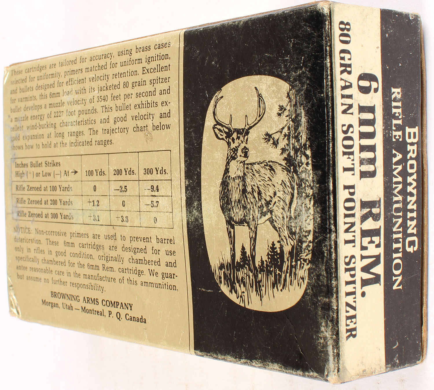 Browning, 6 mm Rem., 80 Grain Soft Point Spitzer, Full, 1pc., multi-colored box, box has scuffing with shelf wear, Ammo is only good and has soiling. Grade: Very Good - Value: 20 to 100