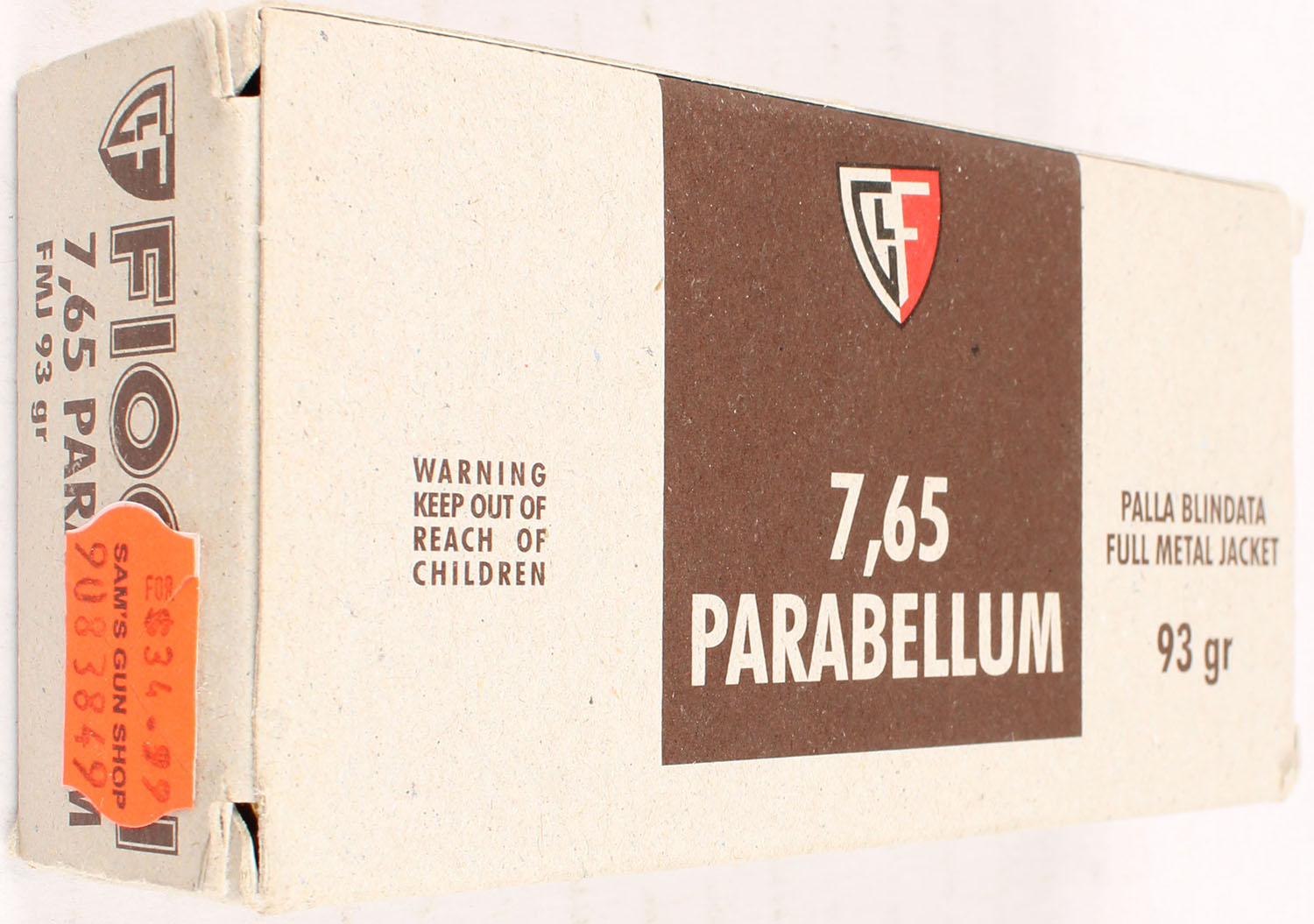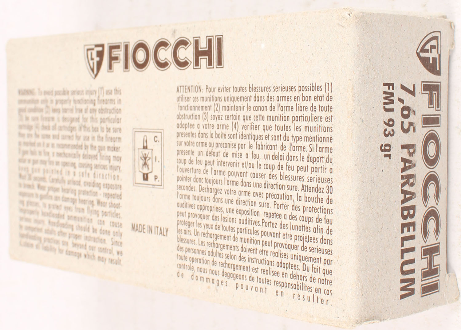 Fiocchi 7.65 parabellum, 1pc, Full, multi-colored box, box is solid has scuffing, ammo is excellent. Grade: Excellent ++ - Value: 16 to 50