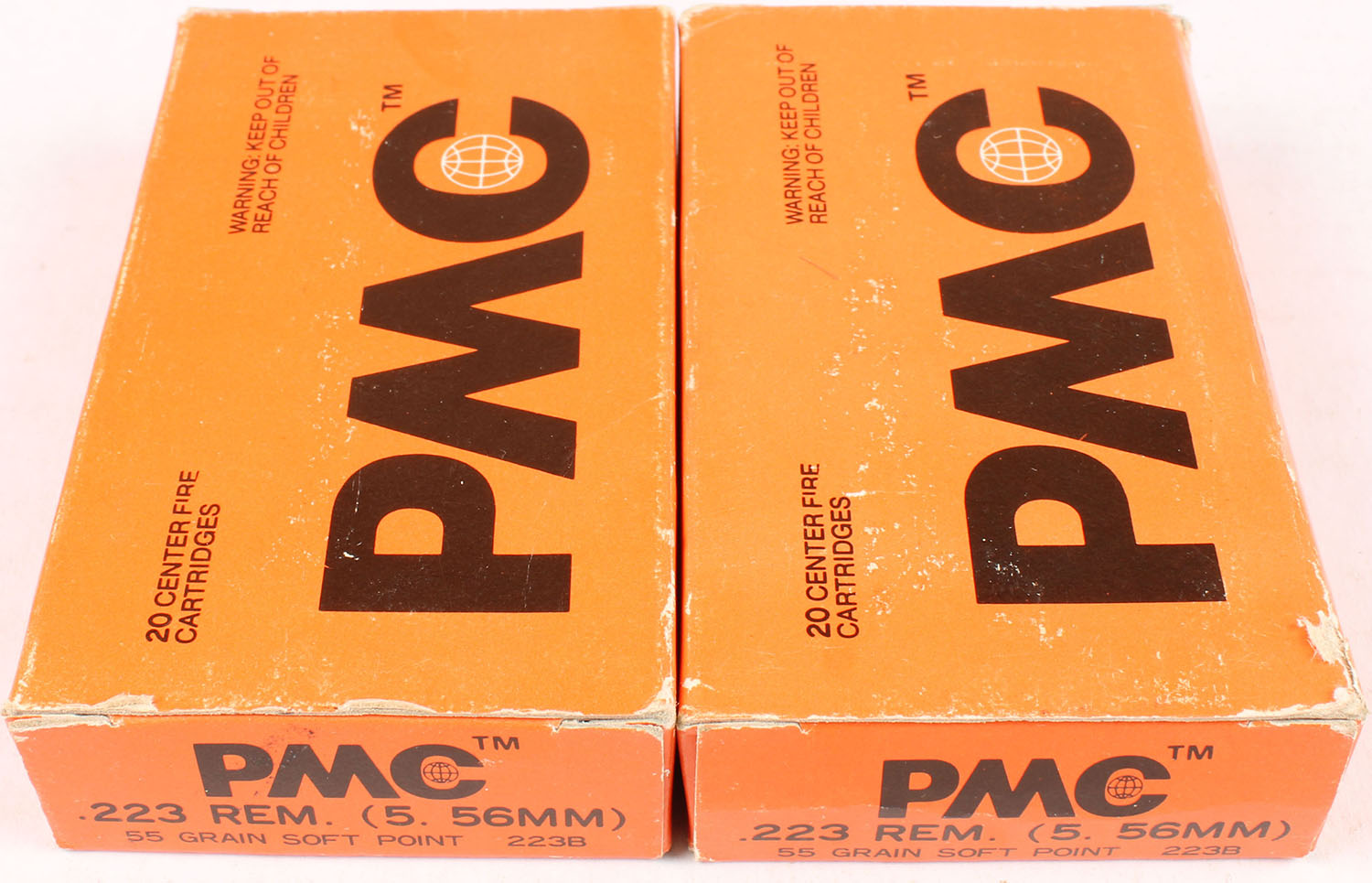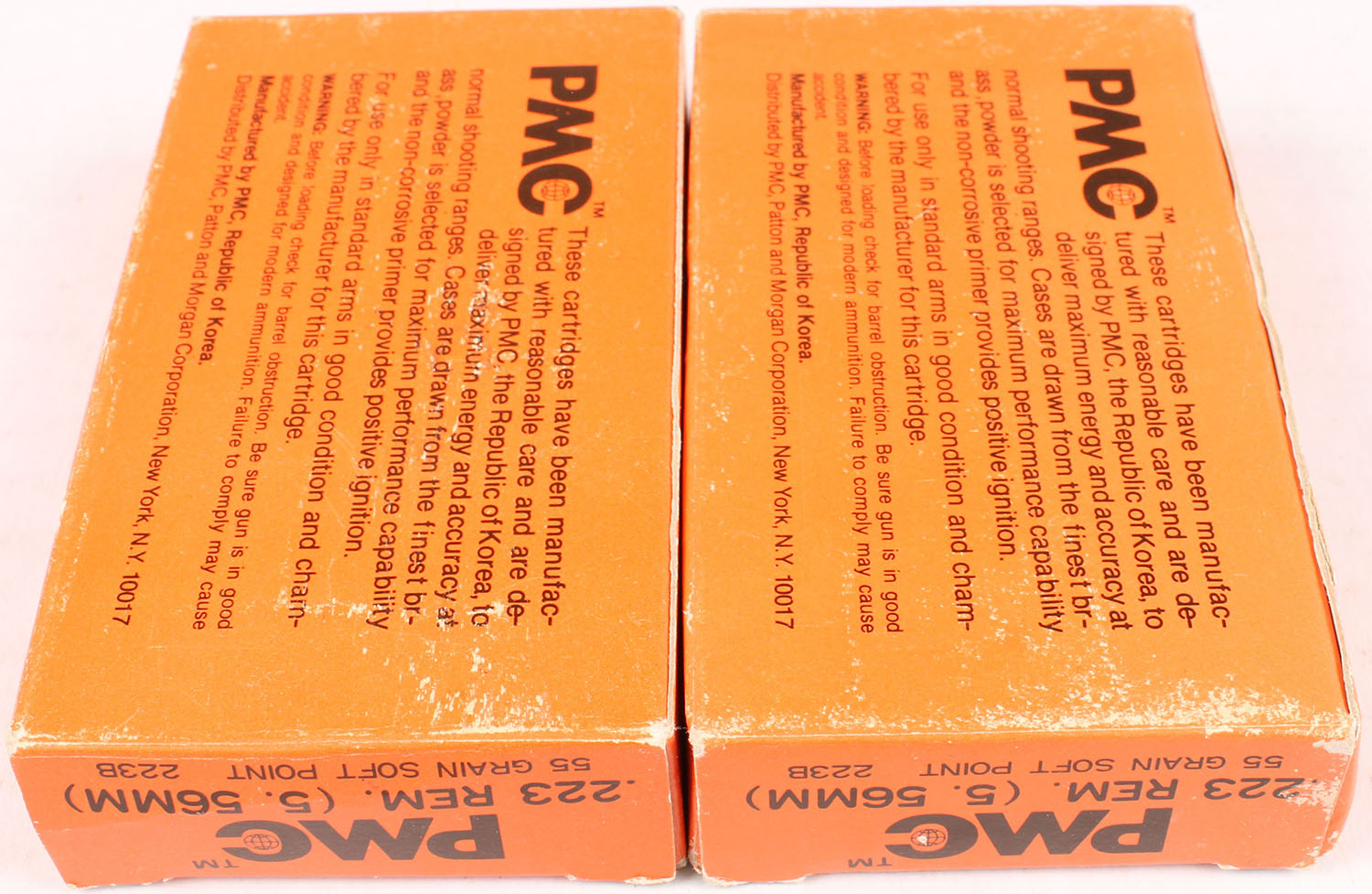 Lot of 2 PMC, .223 Rem., 55 Gr. SP, 1pc, Full, box is solid, ammo is excellent. Grade: Excellent - Value: 6 to 60
