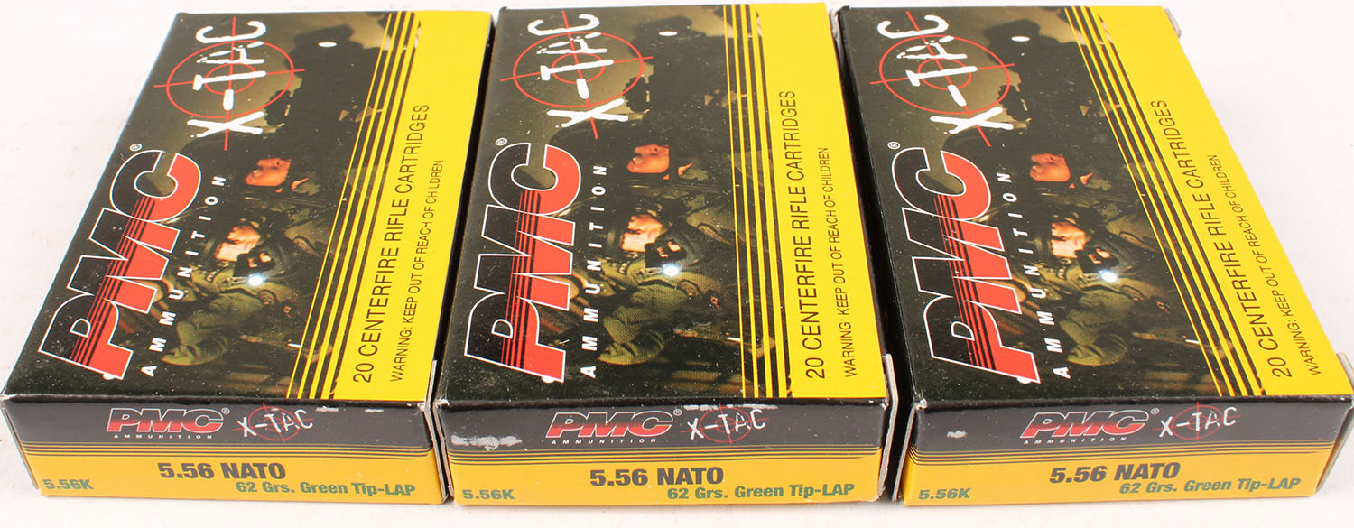 Lot of 3 PMC, X-Tac, 5.56 Nato, 62 Grain, Full, 1pc., multi-colored box, box is solid with excellent color, Ammo is excellent. Grade: Excellent - Value: 10 to 50