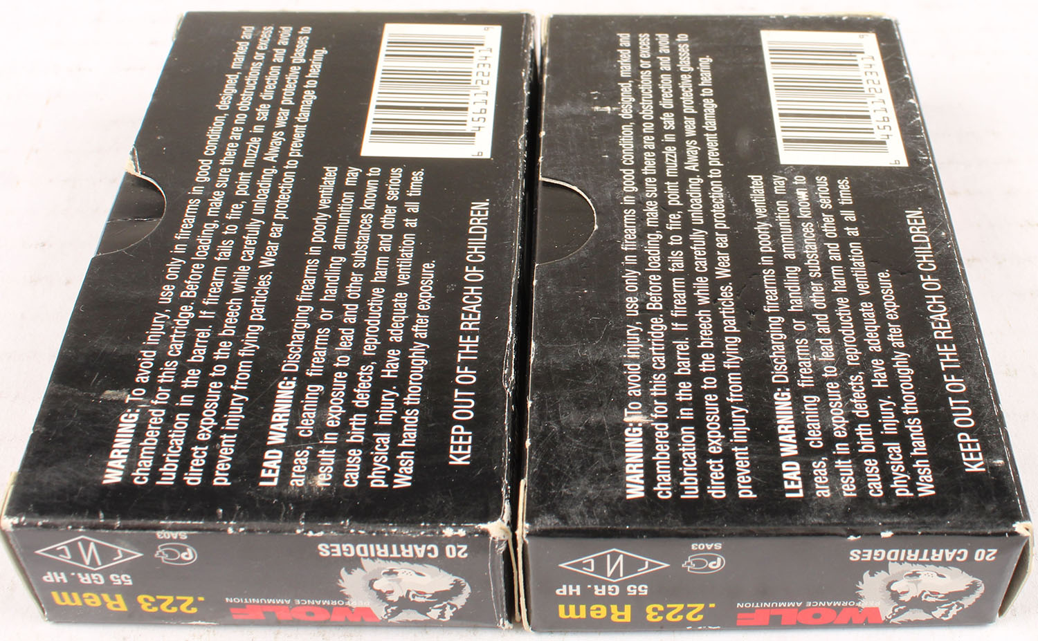 Lot of 2 Wolf, .223 Rem., 55 Grain, Full, 1pc., multi-colored box, box is solid with excellent color, Ammo is excellent. Grade: Excellent - Value: 10 to 50