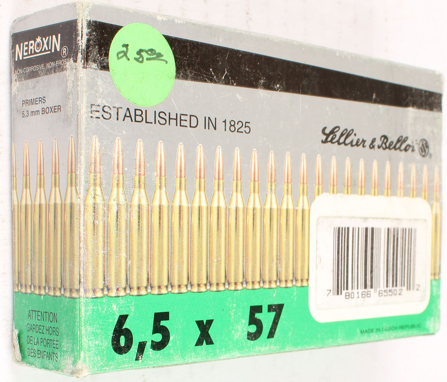 Sellier & Bellot, 6.5 x 57, FULL, has scuffing, ammo is very good. Grade: Very Good ++ - Value: 10 to 50