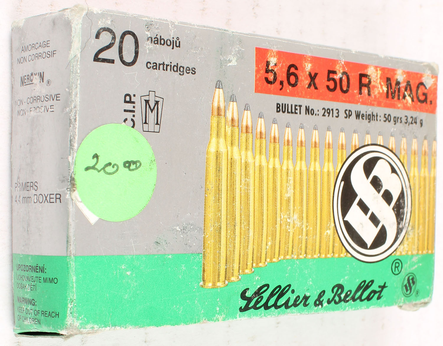 Sellier & Bellot, 5.6 x 50 R MAG., FULL, has scuffing, ammo is very good. Grade: Very Good ++ - Value: 10 to 50