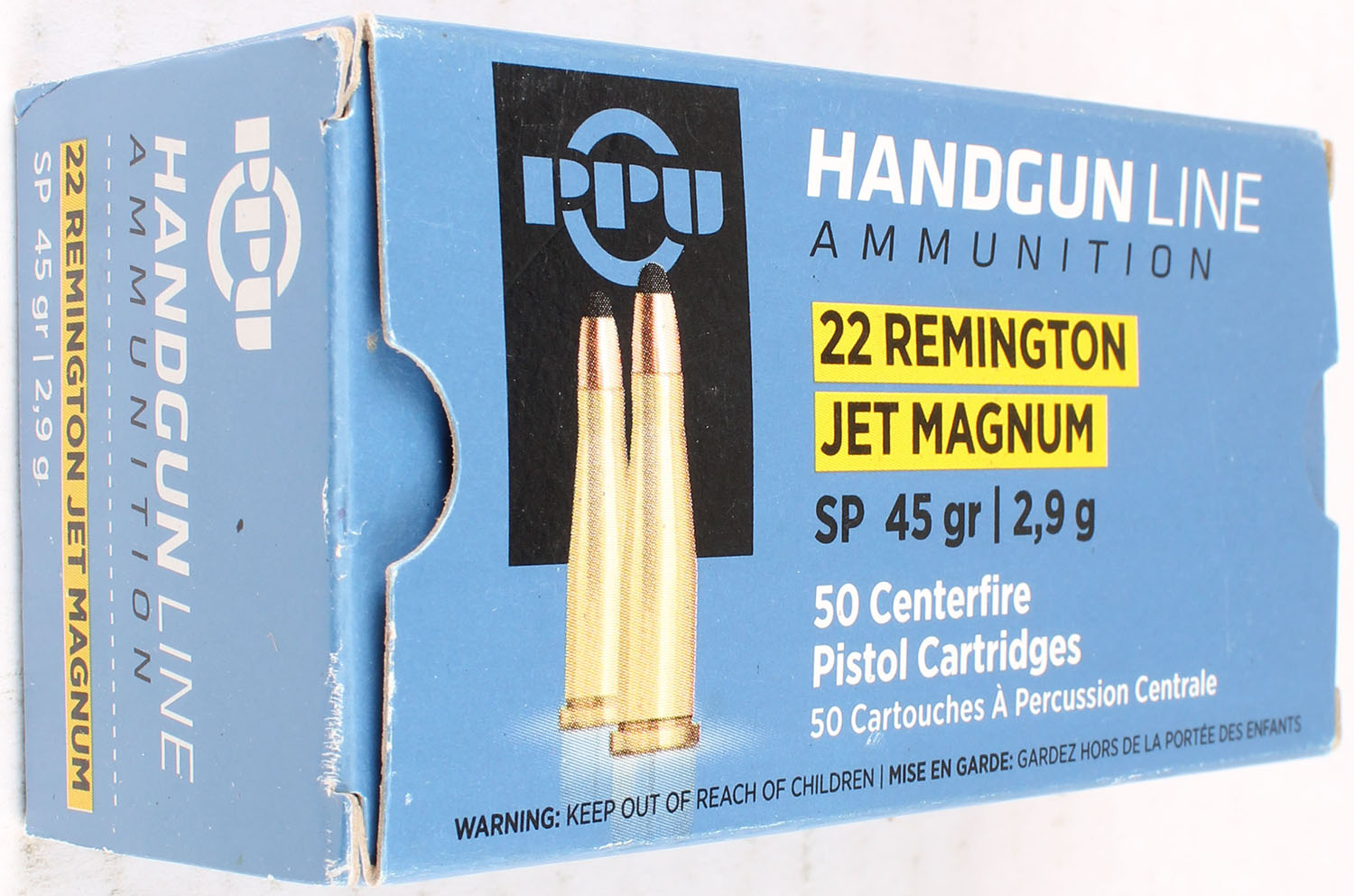 PPU, 22 Remington Jet magnum, 45 Grs., Full, 1pc. Multi-colored box, box is solid, with excellent color, Ammo is excellent. Grade: Excellent - Value: 10 to 50