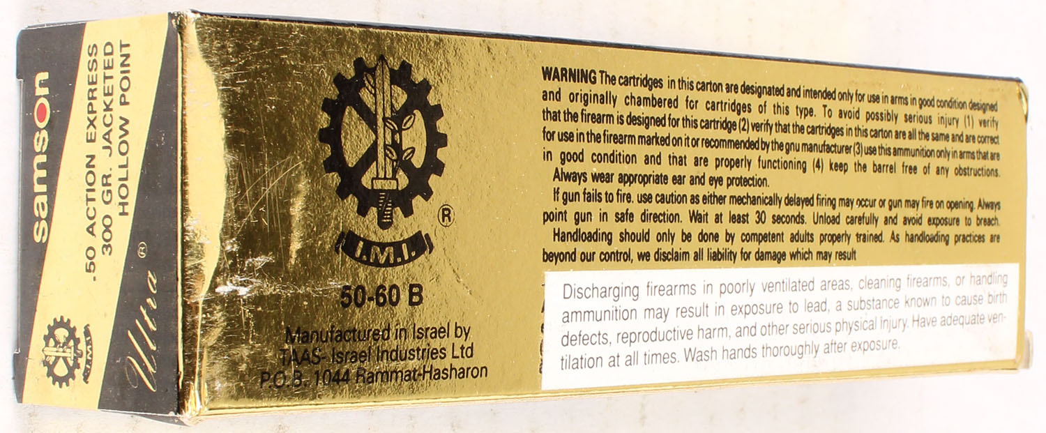 Samson Ultra, .50 AE, 300 Grain JHP, Full, 1pc., Multi-colored box, box is solid with great color, ammo is excellent. Grade: Excellent ++ - Value: 20 to 60