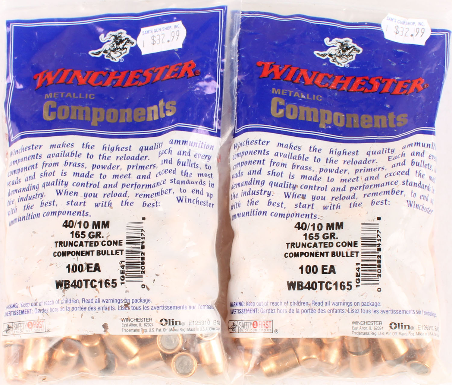 Winchester, Lot of (2) bags of .40 Cal./10mm, 165 Grain Truncated Cone Component Bullet, both bags of 100rds. are full & sealed. Grade: MINT - Value: 20 to 60