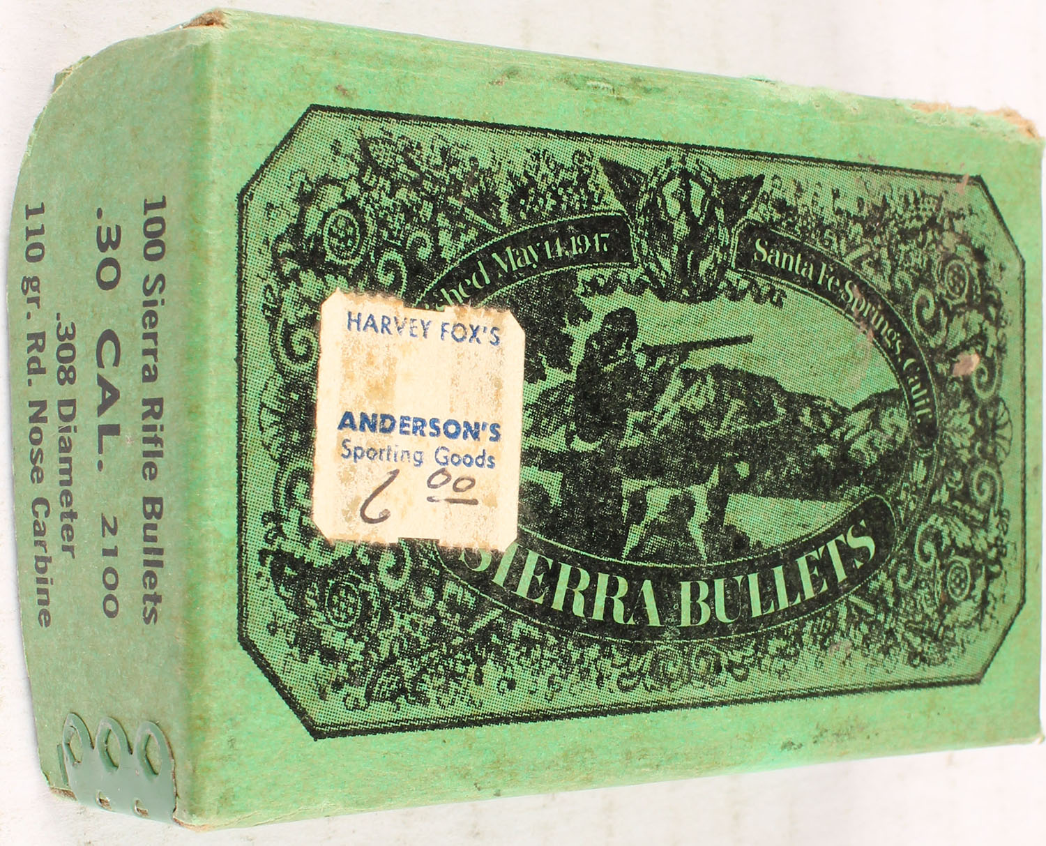 Sierra, .308 Cal., 110 Grain Round Nose Carbine, Full, 1pc. Green & black box, box is soliod with very good to excellent color, minor age soiling & shelf wear, minor corner wear, edges are mostly crisp, top flap is solid, bullets are minty. Grade: Excellent - Value: 10 to 40