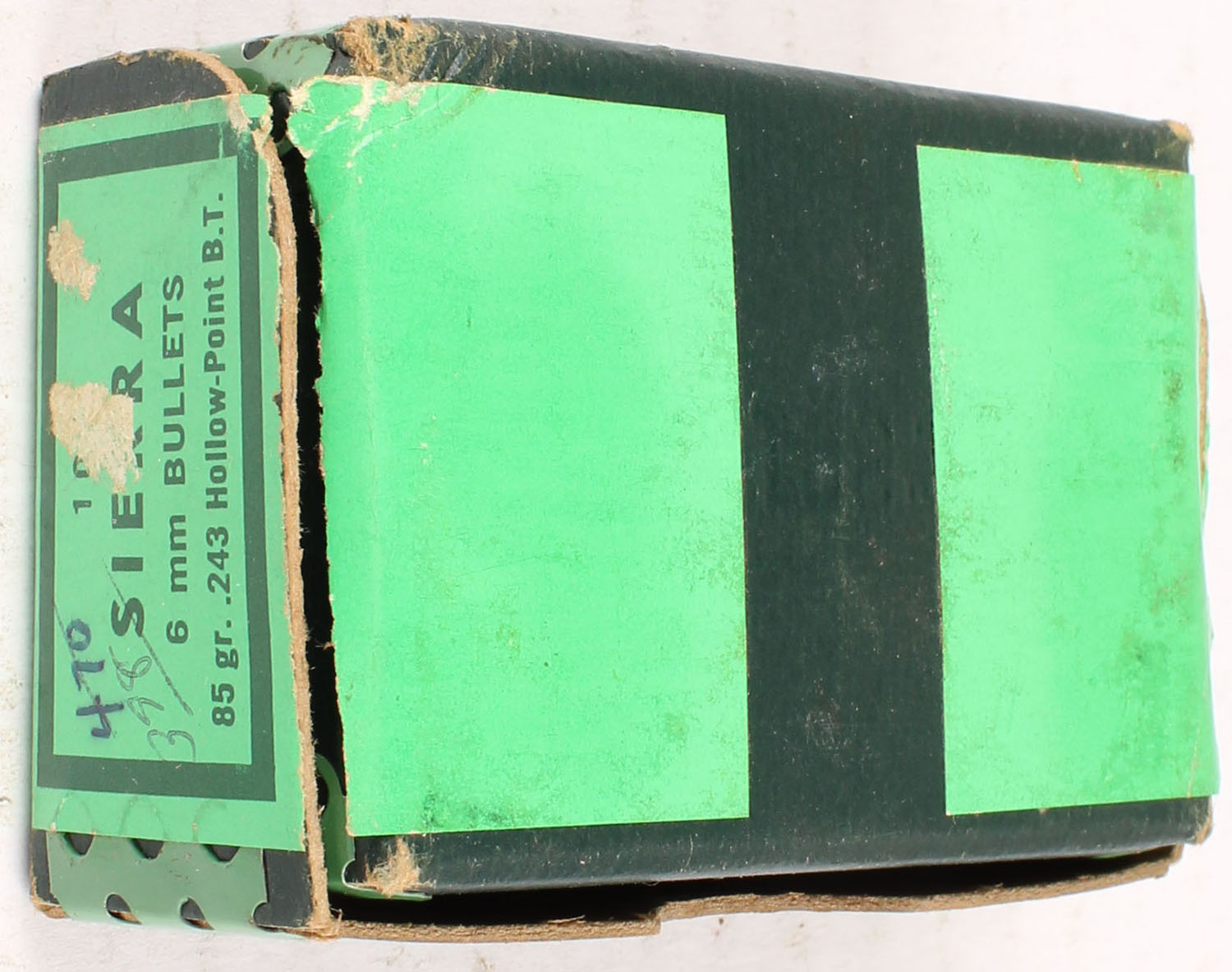 Sierra, 6mm/.243 Cal., 85 Grain Hollow Point Boat Tail, Full, 1pc. Green box with green wraparound label, box is solid with minty color, minor corner wear, edges are mostly crisp, top flap is solid, right end has been written on, bullets are minty. Grade: Excellent + - Value: 10 to 40
