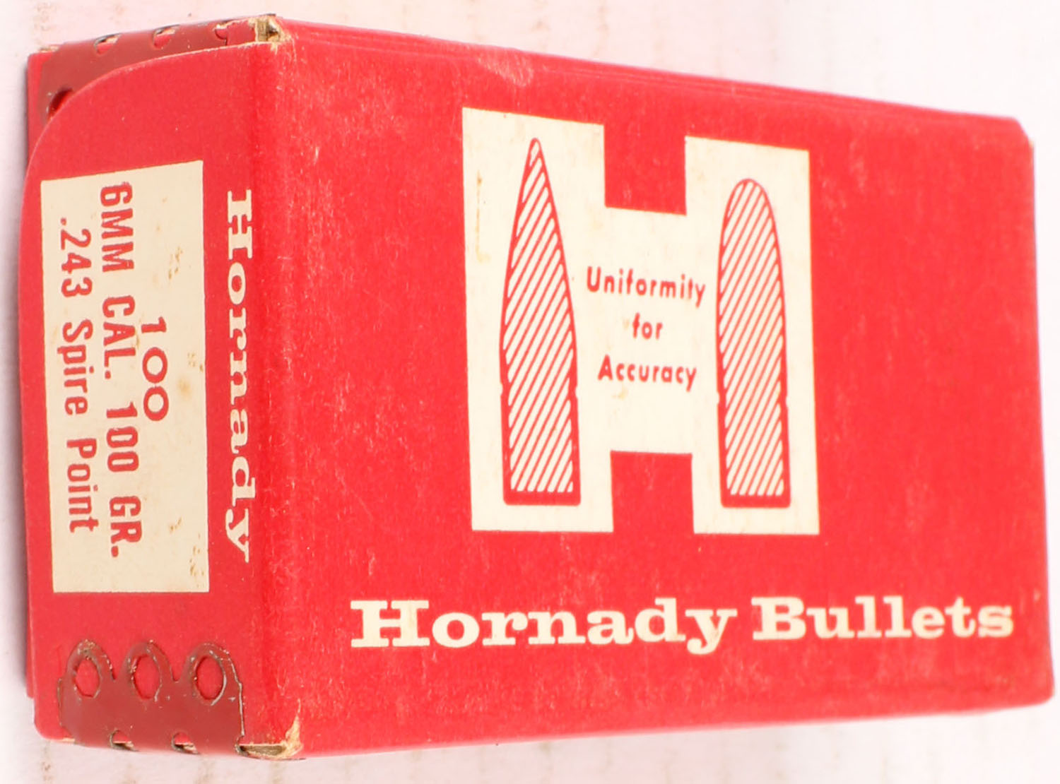 Hornady, 6mm Cal., 100 Grain .243 Spire Point, Full, 1pc. Red & white box, box is solid with excellent color, very minor age soiling, corners are mostly sharp, edges are crisp, top flap is solid, bullets are minty. Grade: Excellent - Value: 10 to 40