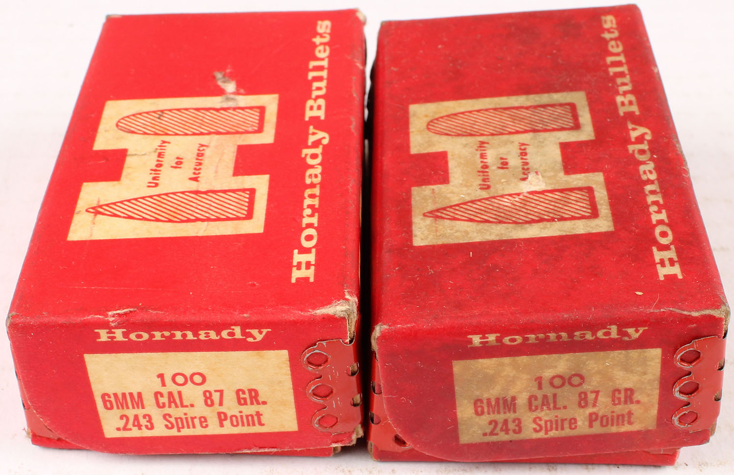 Hornady, Lot of (2), 6mm Cal. 87 Grain .243 Spire Point, Both Full, 1pc. Red & white boxes, boxes are solid with good color, age soiling, both boxes are sticky, corners are mostly sharp, edges are crisp, top flaps are solid, ammo is excellent. Grade: Very Good - Value: 10 to 60