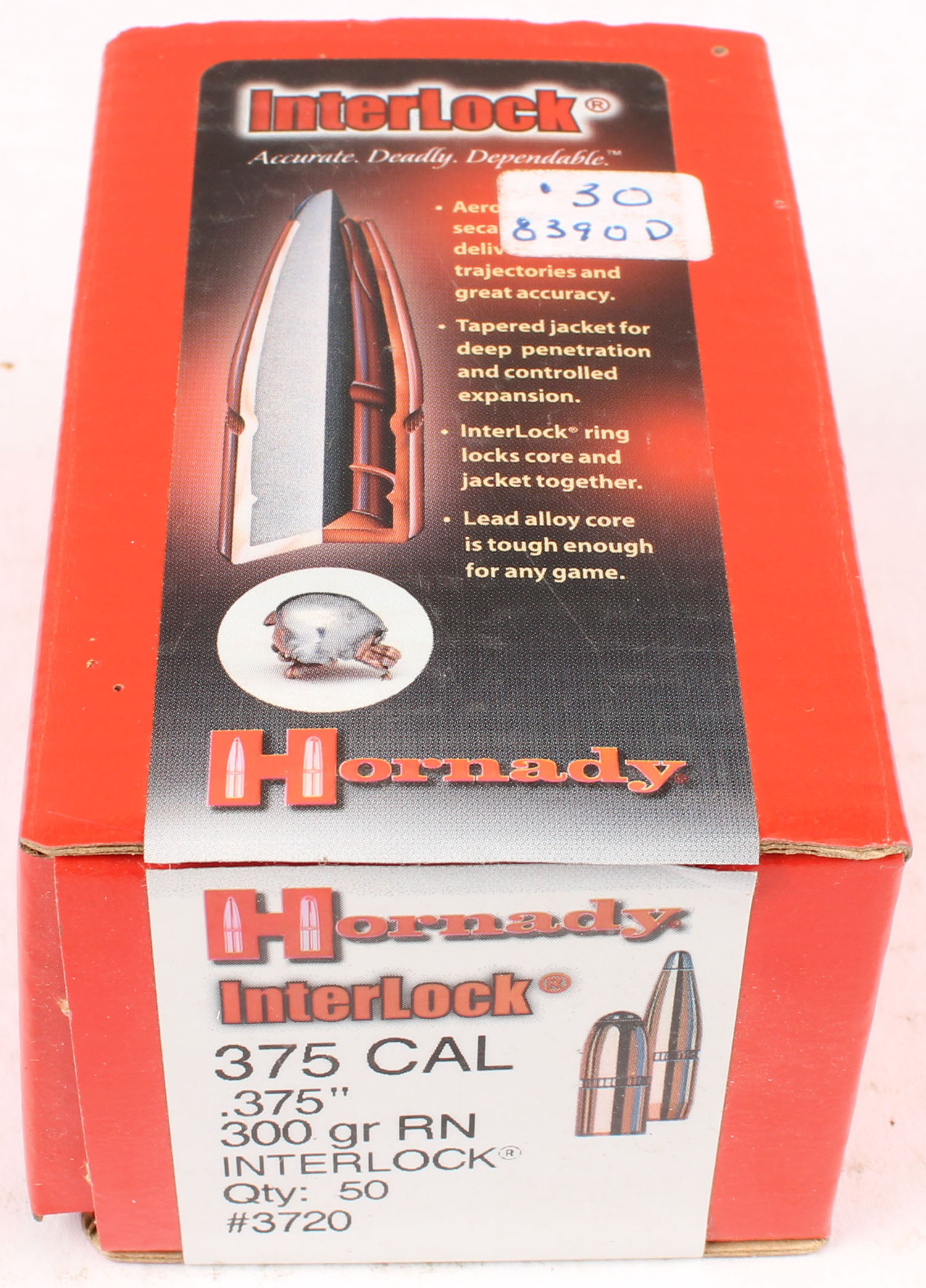 Hornady, Interlock, .375 Cal., 300 Grain Round Nose Interlock, .375 Dia., Full, 1pc. Red box with red black & gray sealing label, box is MINT with minty color, bullets are still sealed, mint. Grade: Excellent ++ - Value: 10 to 40