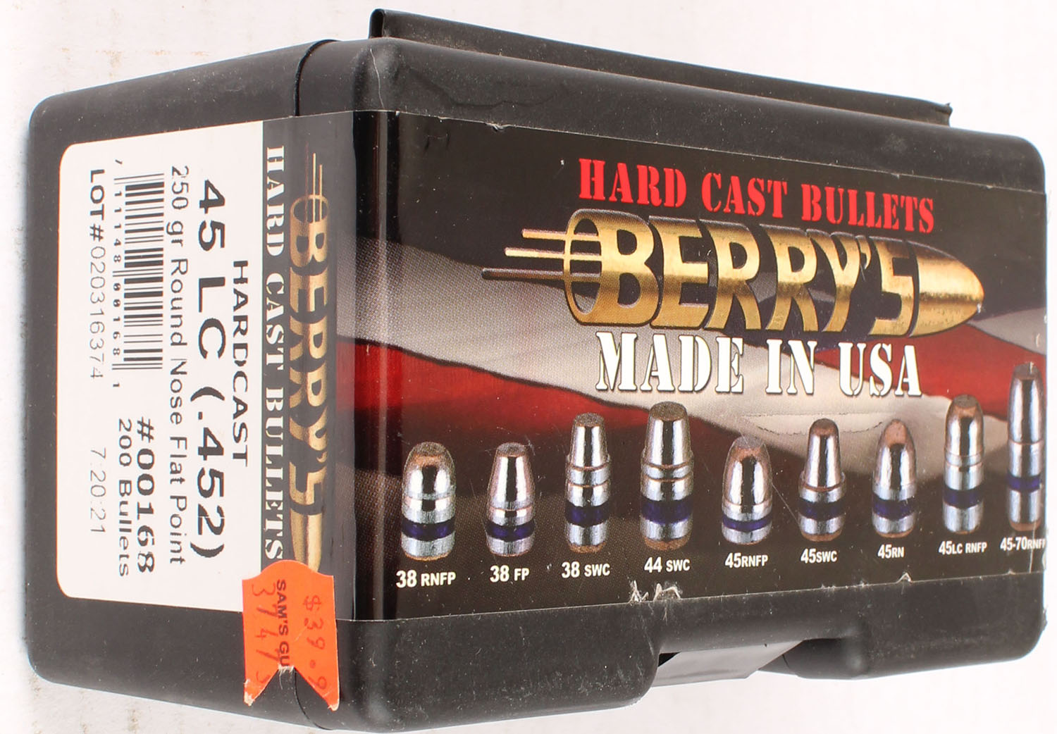 Berry's, Hardcast, .45 Long Colt, 250 Grain Round Nose Flat Point, .452 Dia., FULL & SEALED, 1pc. Black plastic box with multi-colored sealing label, box is MINT with minty color, label is intact. Grade: MINT - Value: 10 to 40
