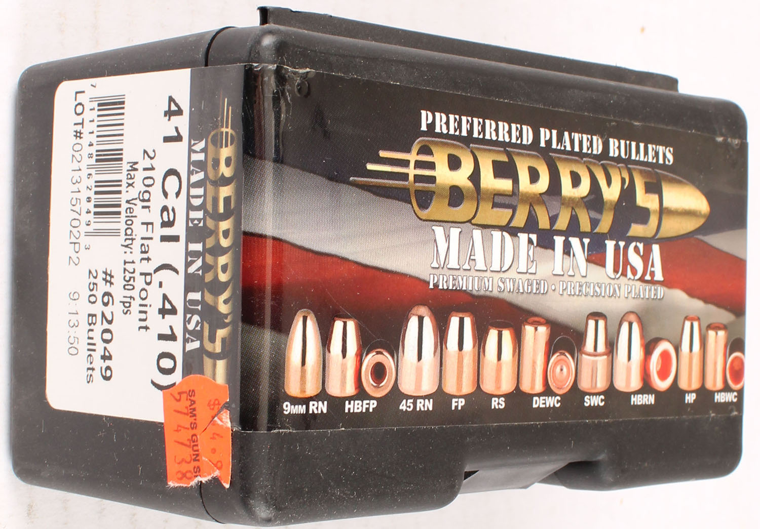 Berry's, Hardcast, .41 Cal., 210 Grain Flat Point, .410 Dia., FULL & SEALED, 1pc. Black plastic box with multi-colored sealing label, box is MINT with minty color, label is intact. Grade: MINT - Value: 10 to 40