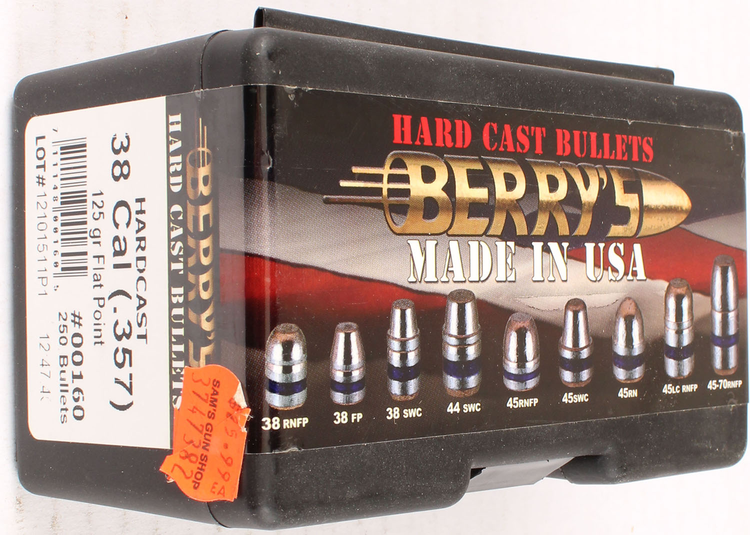 Berry's, Hardcast, ..38 Cal., 125 Grain Flat Point, .357 Dia., FULL & SEALED, 1pc. Black plastic box with multi-colored sealing label, box is MINT with minty color, label is intact. Grade: MINT - Value: 10 to 40