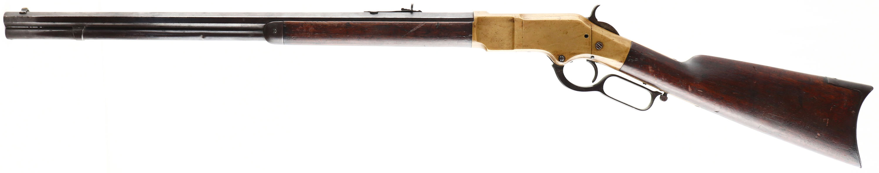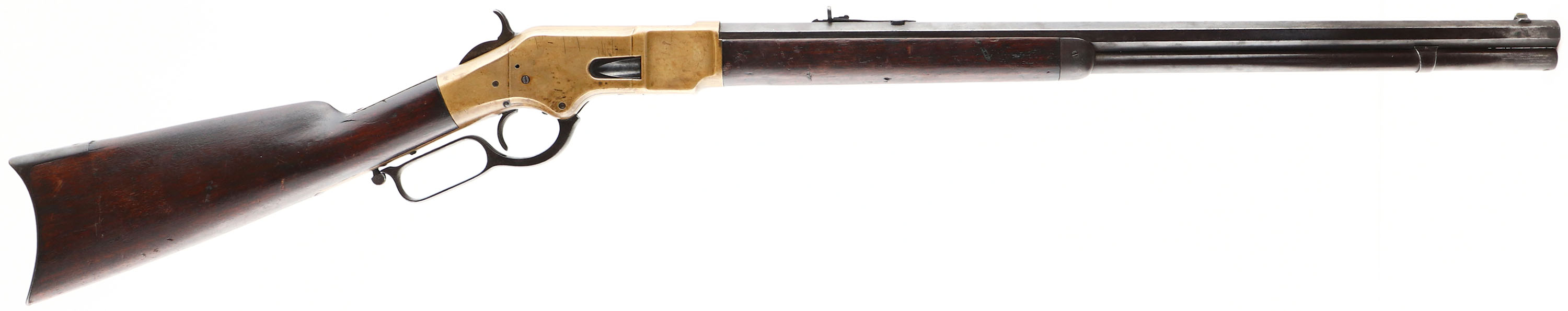 Winchester, Model 1866, Fourth Variation, .44 RF Cal., MFG. Antique, SN: 158641, Lever Action Rifle, 24 1/4'' Octagon barrel, Full mag. The wood stocks are very good & solid, despite a 1 3/4'' stress crack at the left side of wrist emanating from the receiver. The stocks display numerous small nicks, gouges & contusions, & have darkened appearance from age, use & oils. The metal finish on the barrel, mag tube, lever, forend cap & buttplate have fully toned to a full coverage dark chocolate patina. The brass receiver have a darker brown mustard tone & some staining. There are numerous small nicks, contusion & abrasions on the barrel, receiver & other metal parts all consistent with western frontier use. The receiver is missing one sideplate screw & appears to have at least one additional screw replaced. Bore is good, with some pitting & roughness amongst solid rifling. Barrel mounted with an adjustable rear & pinched blade front sight. Rifle has the sliding trapdoor crescent buttplate. Consistent with the 4th model, it has the italic SN stamped on the end of the lower tang. Comes with a Cody Winchester Factory Records letter confirming configuration & dates. This is a rustic survivor 1866, displaying all the character of authentic frontier use. Still a great antique brass rifle. Antique, No FFL Req. - Value: 2500 to 5000
