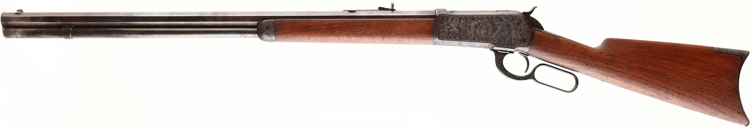 ENGRAVED Winchester, Model 1886, .40-82, MFG. 1893, SN: 80454, Lever Action Rifle, 26'' Octagon barrel, Full mag., This unique rifle was beautifully engraved by Master Engraver Ralph W. Ingle. Ingles unique high-relief scrollwork with stippled matte background is featured on the receiver, buttplate, forend cap, lever, & screws. The rifle was then refinished to give it an authentic vintage appearance. The wood stocks are very good, having been cleaned & refinished. They still display several small scuffs, scrapes & contusions, along with some of the original staining. There is a sliver of missing wood at the right shoulder where the wrist meats the receiver. The metal was refinished with an aged patina complementing the vintage style engraving. The loading gate & top of the bolt retains the original blue. The finish also shows spots of wear & areas of thinning, mostly on the barrel & mag tube. There are spotty areas of pitting & chattering on both the barrel & mag. Standard front & rear sights. Bore is fair, with worn rifling amongst pitting & scarring. There is also a ring in the barrel about 3'' from the muzzle. Stock fitted with a crescent metal buttplate. Desirable for those who appreciate the beauty & quality of a finely engraved firearm, which still retains a more authentic worn & vintage appearance. Antique, No FFL Req. - Value: 6000 to 10000