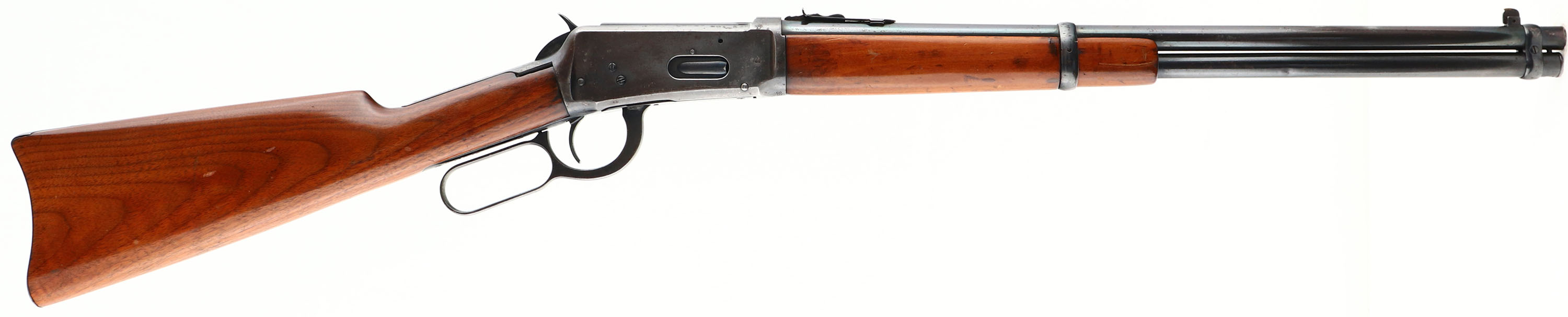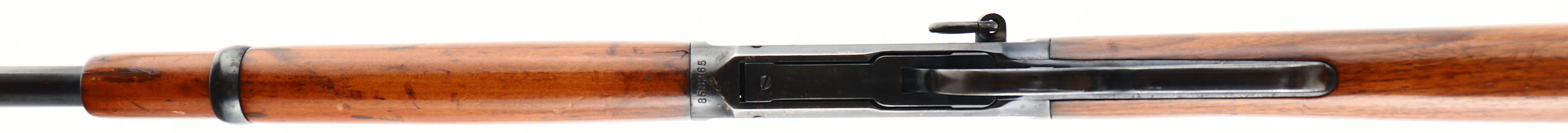 Winchester, Model 1894 Saddle Ring Carbine, CAL: 30 WCF, MFG: 1917, SN: 858265, Lever Action Carbine, 20'' Round barrel, Full mag. The original straight grip wood stocks are very good & solid, as sanded & refinished. There is a small gap in the fit of the shoulder of the stock & receiver on both sides, which does not appear to be a missing sliver or break, but does need to be mentioned. There also remains some of the minor scratches & contusions. The original metal blue finish rates 70%, but with lots of spotty areas loss, cleaned corrosion & pitting. Bore is excellent. The barrel holds an adjustable rear sight & carbine box front sight. Stock carries a carbine metal buttplate. Original saddle ring. Tight action. Has a nice appearance & should be a good shooter. FFL or C&R Req. - Value: 500 to 1000