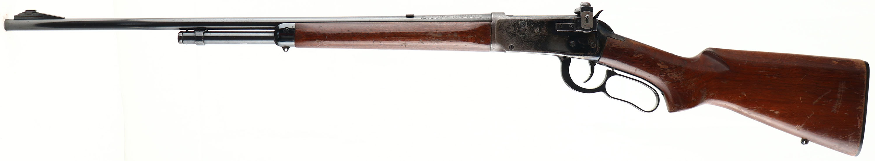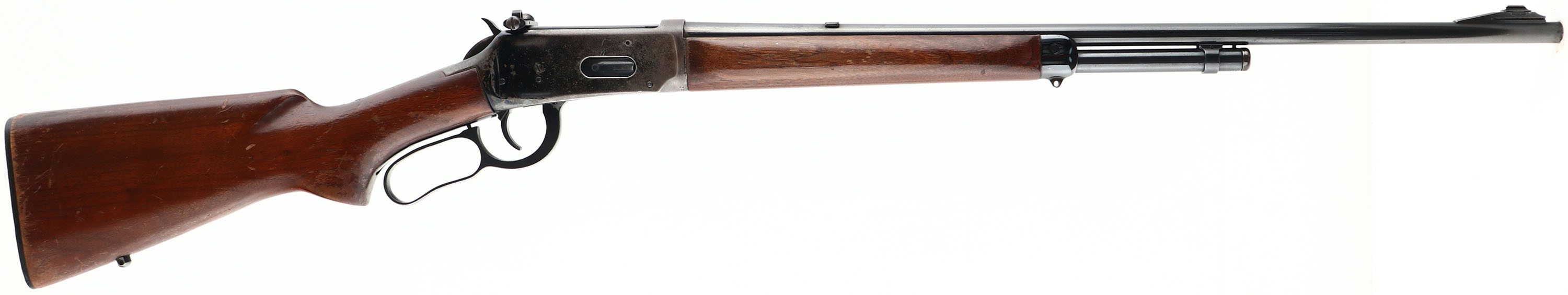 Winchester, Model 64A, marked 30-30 WIN, MFG. 1972-73, SN: 3595315, Lever Action Rifle, 24'' Round barrel, mag holds 7 rounds. This is one of the rarer & fewer made Winchester models produced, with an estimated 12,000 rifles. The 64A was a direct copy of the 1871-1971 M-94 NRA Centennial Rifle commemorative, less the NRA's engraving & medallion, & is a lot like the pre-64 Model 64 in style, but not exact. The model 64 was made from 1933-57 produced only 66,783 total rifles. The original pistol grip wood stocks on this example are very good & solid, although the original finish shows lots of wear or flaking along with other scuffs, dings & scratches. The original metal blue finish is 90% on barrel & mag, but just 25% on the receiver due to flaking & wear loss. Bore is excellent. The rifle carries an adjustable Lyman receiver peep sight, a blank filled rear dovetail & a front ramp sight, missing the hood. Stock carries a checkered Winchester plastic buttplate. Factory sling provisions. A fairly rare low production rifle & popular in the 30-30 as a deer rifle. FFL or C&R Req. - Value: 600 to 1000