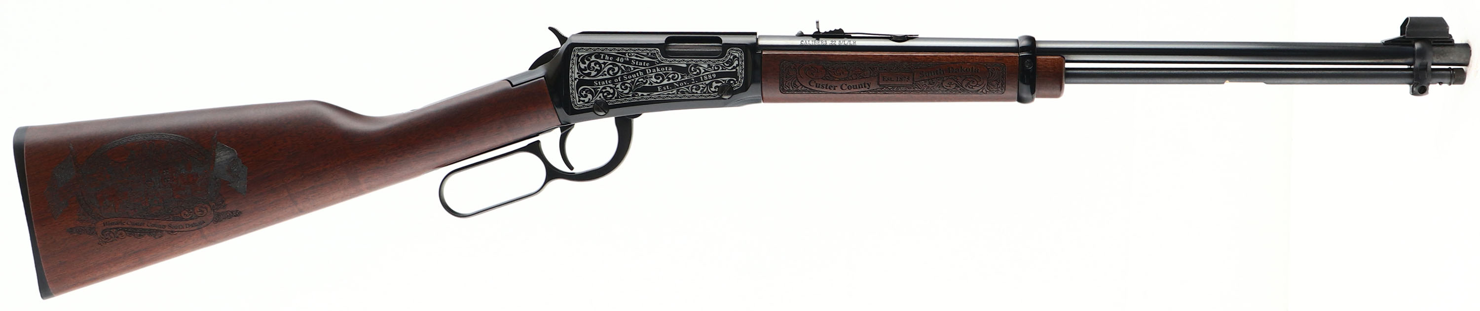 BOXED, Henry Repeating Arms Co, Model H001 Historical Armory Inc Custer County South Dakota, CAL: 22LR, MFG: Modern, SN: 957863H, Lever Action Rifle, 18 1/2'' barrel. The custom engraved straight grip wood stocks are excellent. The right side of the stock displays original artwork, & finely detailed engraving to celebrate the history of Custer County. The right side of the forend is marked ''CUSTER COUNTY EST.1875 SOUTH DAKOTA'' encompassed by decorative floral scroll. The left side of the forend is marked ''THE MOUNT RUSHMORE STATE'', also with decorative floral scroll. The left side of the receiver is marked ''5 OF 25 UNITED STATES OF AMERICA EST JULY 4TH 1776'' & the right side of the receiver is marked ''THE 40TH STATE OF SOUTH DAKOTA EST NOV 2, 1889''. The straight grip wood stock is excellent. The metal blue finish rates 99% overall. Bore is excellent. The barrel holds an adjustable rear sight & hooded post front sight. Stock has Henry checkered plastic buttplate. Comes in original box, with related paperwork. Box condition is good, with overall wear. There were only 25 Custer County South Dakota rifle sets ever produced by Historical Armory. FFL Req. - Value: 600 to 800